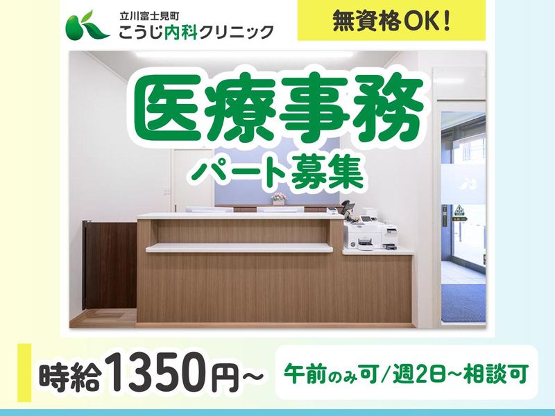 仕事内容 \経験があれば無資格でOK/ 【 受付・医療事務 】募集!! ⭐2024年12月にオープンしたばかり♪ ⭐車・自転車通勤OK!駐車場完備! ⭐月/火/木/土の午前中で週1回(曜日固定)~でOK ⭐40代・50代女性を中心に活躍中☆ ⭐予防接種などのスタッフ特典あり! 「子どもが学校の間だけ」 「久しぶりだから短時間で」 \ そんな方を応援します! / ▼午前中のお仕事の流れ▼ 8:15~(土8:45~)/出勤・着替え・準備 8:30~(土9:00~)/受付・診療開始 ~12:30/診療終了 ※現在、残業はほぼありませんが、繁忙期 にはお願いするかもしれません(要相談) 曜日・日数は相談OK! 家事・育児と無理なく両立できます◎ 高時給1350円~だから短時間でも コスパよく稼げるのもポイント♪ -*仕事内容*- ■受付、電話対応 ■会計 ■予約対応 ■レセプト作成 ■患者様の誘導 ■他、医療事務業務全般 患者様はシニア世代の方がほとんど。 午前中が忙しく、午後は比較的 ゆったりとしています。 顔なじみの方も多く、あたたかく 家庭的な雰囲気のクリニックです♪ -*当院について*- 内科、腎臓・リウマチ膠原病専門の 『こうじ内科クリニック』です。 院長の生まれは昭島市、 現在は立川市に在住。 杏林大学病院・杏林大学杉並病院にて 勤務したのち、地元である昭島・立川で より身近に地域の方の健康をお守りしたい という想いから開院しました。 比較的専門医の少ない診療科である 腎臓・リウマチ膠原病内科を診療し、 内科系の疾患をお持ちの患者様を 幅広く受け入れ、必要に応じて 基幹病院へ紹介するなどして 地域の皆さまが安心して通える かかりつけクリニックを目指します。