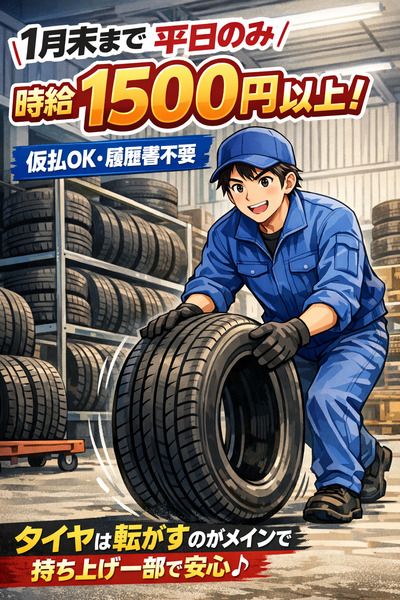 【3月から夏場まで短期】日曜定休の週3日~OK♪タイヤをコロコロ転がす作業で筋トレ代わりピッタリ!最大時給1600円で私服OK・履歴書不要・仮払OK!