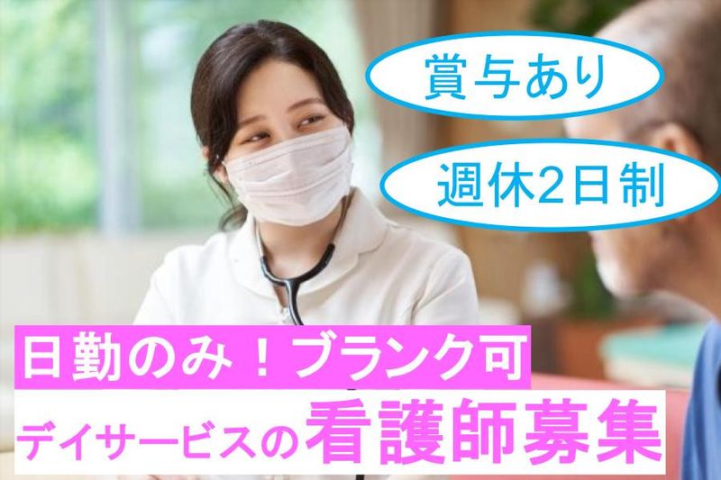 【アピールポイント】 デイサービスの看護職員を募集します! ■賞与あり ■日勤のみ ■介護施設未経験OK! ■年齢不問! ■ブランクOK!