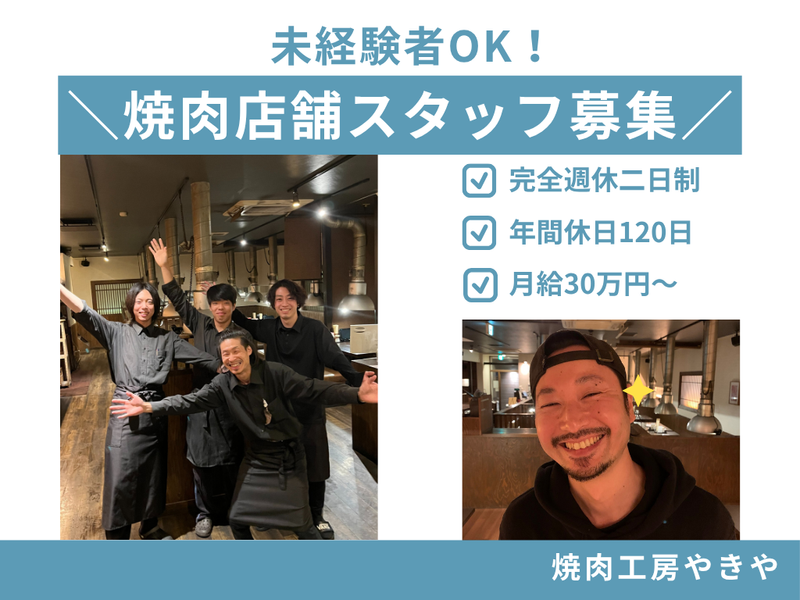 仕事内容 ✨年間休日120日 ✨完全週休二日制 ✨未経験でも30万円スタート ✨特別休暇多数ご用意! 「接客の仕事は好きだけど、 将来を考えると給与が上がりにくい…」 「お休みが不規則で、 プライベートの予定が立てづらい…」 そんな悩みを持つあなたへ。 その「人当たりの良さ」や「素敵な笑顔」、 『焼肉工房やきや』で活かしませんか? 私たちが目指すのは、 “笑顔があふれる店舗づくり”。 調理スキルや飲食の経験は一切問いません。 お客様をパッと明るい気持ちにできるような 「第一印象」と「素直な人柄」を活かして、 ぜひ当店で活躍してみませんか? あなたからのご応募お待ちしております♪ ⭐「やきや」が選ばれる3つの理由 ┈┈┈┈┈┈┈┈┈┈┈┈┈┈┈┈┈•• ✅ 頑張りを収入で還元! 月給30万円~ 「頑張りを正当に評価したい」という想いから、 未経験の方でも月給30万円以上を保証します。 実際に、20代社員の平均月収は約32.8万円。 さらに賞与年2回、資格手当や歩合給もあり、 あなたの「笑顔」や「気配り」が、 しっかりと収入に反映される環境です! ✅ 飲食店なのに「年間休日120日」! 「飲食店=休みが少ない」そんなイメージを覆します。 私たちは、プライベートの充実が 仕事のパフォーマンスにつながると信じています。 ・完全週休2日制(シフト制) ・年間休日120日 ・誕生日休暇、記念日休暇 ・春休み、秋休み ・自由取得型長期休暇制度 など… お休みがしっかり取れるから、 メリハリをつけて働けます。 ※23時までの営業のため、帰宅は少し遅くなりますが、 その分、お休みと給与でしっかり応えます! ✅ あなたの「接客経験」が活きる場所 単なる接客ではなく、 「また〇〇さんに会いに来たよ」 とお客様に言っていただけるような 温かい空間づくりを重視しています。 ⭐お任せするお仕事 ┈┈┈┈┈┈┈┈┈┈┈┈┈┈┈┈┈•• 予約管理からお客様のご要望のヒアリングまで、 店舗運営の核となるポジションをお任せします。 【具体的には…】 ・お客様のご案内 ・オーダー取り ・料理やドリンクの配膳 ・お会計、お見送り ・カンタンな調理補助、仕込み など… 慣れてきたら、シフト作成やアルバイト指導、 商品開発、飲食店運営に関する業務もお任せします◎ あなたのペースに合わせて丁寧に教えますのでご安心ください。 ⭐当店について ┈┈┈┈┈┈┈┈┈┈┈┈┈┈┈┈┈•• 『焼肉工房やきや』は、 お客様の笑顔はもちろん、 スタッフが「楽しく輝きながら働ける」 会社を目指しています。 「第一印象8割」を掲げ、 経験よりも「素直さ」や「人当たりの良さ」 を正当に評価。 仲間と力を合わせ、 お客様も自分自身も笑顔になれるお店で 一緒に働いてみませんか?