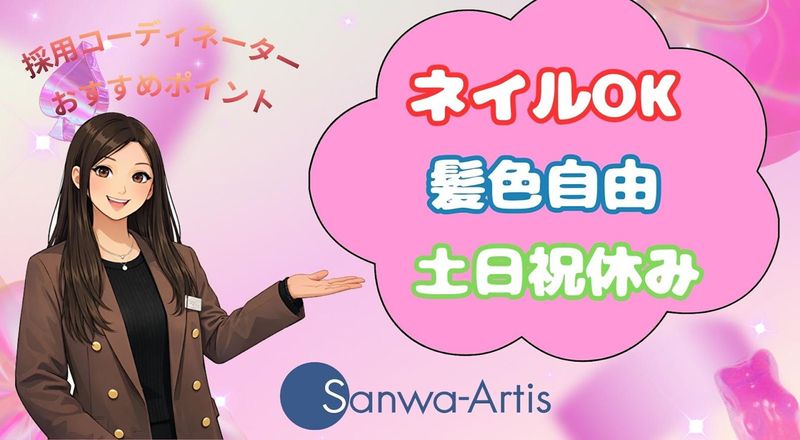 選考プロセス 1.オンラインでの登録 スマホ・タブレット・PCがあれば、 いつでもその場で登録が可能です! ※履歴書は不要です 2.サンワアルティス事務所での登録 住所:熊本県菊池市泗水町吉富205-4 ※履歴書は不要です 1、2の方法いずれかよりご選択可能◎ どちらも事前に予約が必要となります。 ご希望は担当者までご連絡ください。 ⭐入社日はご相談ください ⭐応募前、職場見学可能 <担当者> サンワアルティス株式会社 採用担当者 TEL:0120-880-889 携帯:080-8560-7040 □■──────────────■□ 最後までお読み頂き 誠にありがとうございます! 詳しくお仕事について 話を聞いてみたいッという方も大歓迎! これまでのご活躍や お仕事に対するご要望など、 詳しくお伺いさせて頂いた上で ピッタリのお仕事をご紹介したいので、 まずはお気軽にご相談ください♪ □■──────────────■□ 応募後のプロセス >>担当より追ってご連絡いたします。