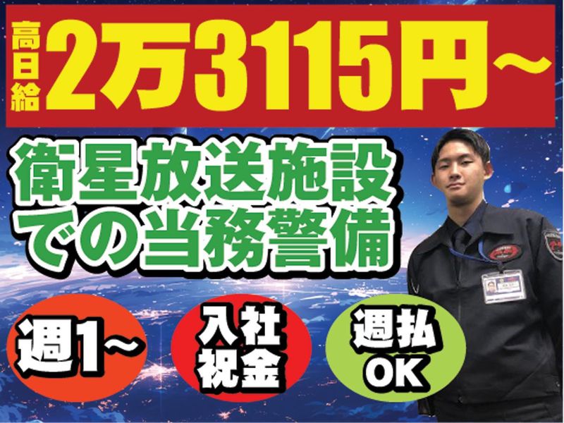 仕事内容 ―――――――――――――――― 働く日はガッツリ働きたい派の人に オススメ!当務の施設警備! ―――――――――――――――― 大手衛星放送企業の出入管理、施設内の 巡回業務をお任せします。 特別な経験やスキルは不要です。 未経験者も女性もシニアも活躍しています! ガッツリ高収入で稼ぎたい方も、気ままに 週1日程度、働きたい日だけ働きたい人も みんな理想通りのワークスタイルが描ける のがカティンデーンの魅力! \POINT1【週払いOK】/ 急な出費にも即対応可能な週払いOK もう、金欠なんて心配はありません! \POINT2【入社祝金5万円】/ 勤務給与とは別に、5万円の入社祝金が 貰えるチャンス。 \POINT3【面接は1回のみ】/ 面接は1回だけ!学歴・性別・経験など 一切関係なし人柄重視で採用します。 \POINT4【短期もOK】/ まずは、お試しで短期間だけ働いてみよう かなって人も大歓迎です。 試して良かったら継続勤務してくださいね。 \カティンデーンはこんな会社!/ 2012年に設立し2013年から業務を開始した 比較的新しい警備会社ですが、きちんとした ノウハウを持っており、企業成長の速度が著 しい注目の成長企業です。現在は仕事量も豊 富で、多岐にわたる警備業務を請け負ってい ます。 この求人を見て、入社した後に別の現場を 希望することも可能。 まだまだ、成長過程にある会社なので、 今後、管理職ポストの増加も見込まれます。 アルバイトから社員へ、そして会社を担う 管理職へのキャリアアップも他の会社では ありえない程のスピードで実現可能です。 もちろん、週2日程度、気ままに働くワーク スタイルでも働きやすい社風なので、 気軽に働きたいという方も大歓迎です! 常に最先端のセキュリティ技術を導入してい て、現在、ドローンを使用した離島警備に向け 有志を募って技術を磨いています。 ドローン免許も会社負担で取得できるので、 興味がある方は、チャレンジしてみると、 さらに警備の仕事のやりがいを感じる事が できるかも!! ロケット発射地の警備もあります。