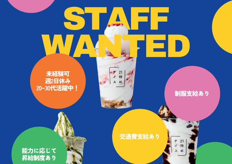 求めている人材 ▼こんな方は是非ご応募ください♪ □人と話すのが好きな方 □流行に敏感な方 □接客や販売に興味がある方 □アイスやパフェなどのスイーツが好きな方 ⭐接客程度の英語を話せる方は優遇します! ※高校生の採用実績はありません 年齢の条件と理由:あり(例外事由2号・18歳以上(労働基準法))