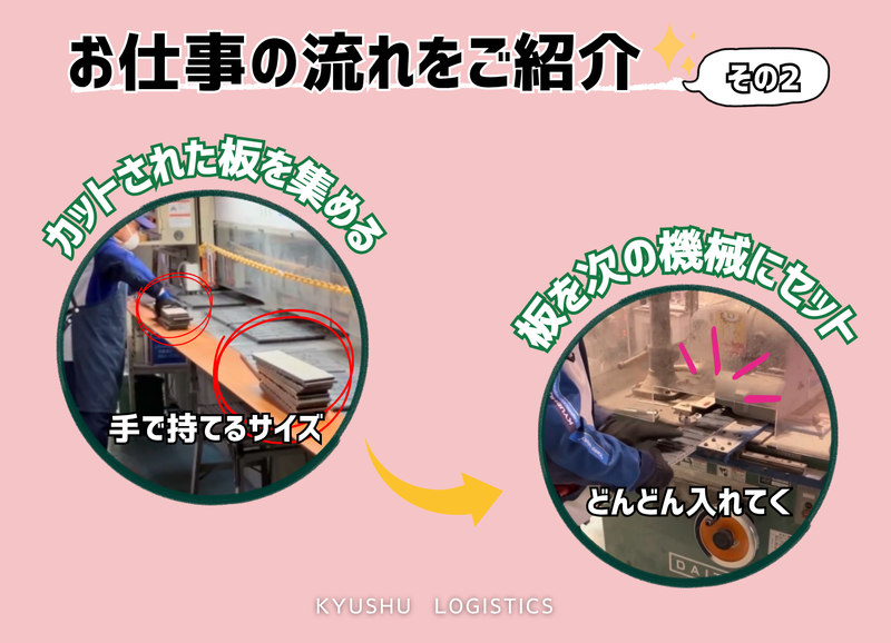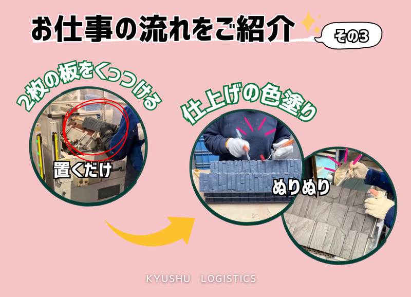 仕事内容 <土日祝休み×日勤のみ> カット、セット、ぬりぬり作業! 女性中心に活躍中♪ ============ 【オープニングスタッフ募集】 住宅の外壁に使われる板(一部)を製造するお仕事です。 簡単に言うと、板を切る→貼る→塗る!の簡単作業です。 毎回全部の工程をするわけではなく、工程のどれかをお願いします。 <作業の流れ> 【設備投入】薄くて長い板を台にセット 【板回収】(機械がカットしてくれて)カットされて小さくなった板を集める 【積載】次のカットしてくれる機械に投入(軽い!) 【設備投入】でてきた板2枚に接着剤を付けて、形が▲になる機械に置く(いいかんじにくっつけてくれる) 【仕上げ】付け根をコロコロで色を塗ったり、筆で色を塗ったりして仕上げる(コロコロ、ぬりぬり作業) 【検査・梱包】最後にチェックして、段ボールに詰める こちらの工程は女性中心に、男女活躍しています♪ 【未経験・ブランクOK✨】 独り立ちするまで、入社後1~3ヶ月程度は先輩が横について作業を教えてくれますので、分からないことはすぐに質問できます。 職場では、"安全運転第一"を心がけており、焦らず、確実に技術を習得できる環境を整えています。 一人デビュー後も近くに先輩はいますので、フォローが必要な時はサポートします。 【九州物流株式会社について✨】 わたしたち九州物流株式会社は、住宅建材の製造加工を主軸に、1982年の創立以来、高品質で信頼性のある製品の提供に努めております。 自社工場内で大手外壁材メーカーの純正品を加工・塗装、メーカー工場内でラインやリフト作業、構内物流などをのお仕事を請け負っています。 また、本社がある福岡県北九州市のご当地ヒーローキタキュウマンのメインスポンサーなども行っています。
