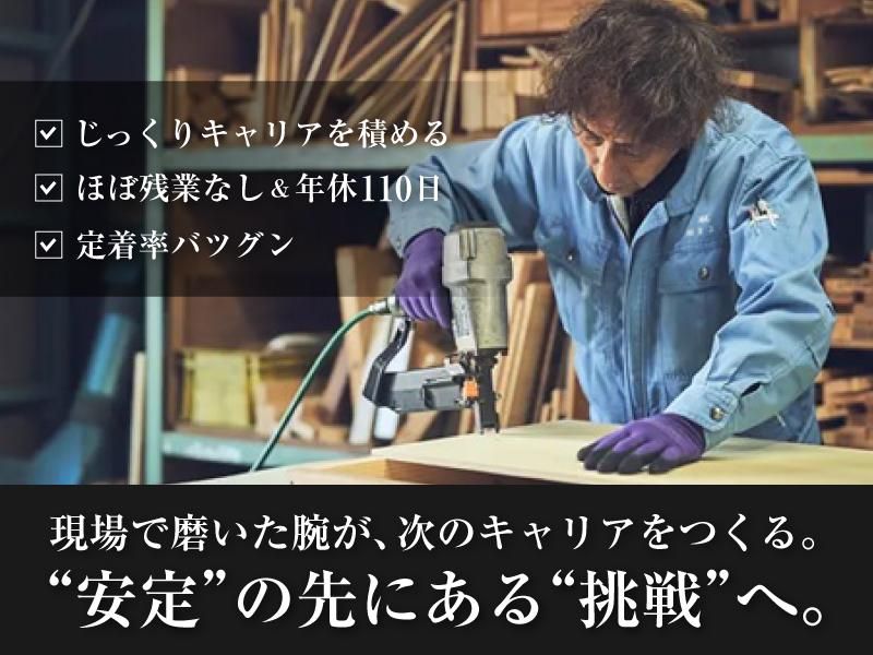 仕事内容 ◤ ̄ ̄ ̄ ̄ ̄ ̄ ̄ ̄ ̄ ̄ ̄ ̄ ̄◥ モノづくりの感覚を 次のステージで。 ◣_____________◢ ❏17:25定時&残業ほぼなし ❏昼食補助あり(半額負担) ❏年休110日でプライベートも充実 ❏40~60代のベテランが活躍中 ━━━━━━━━━━━━━━━ 木を切って、削って、組み立てる。 ──そんな“手の感覚”を 大切にできる仕事です。 私たち『ミズノ』は、 オフィスや公共施設で使われる イスやソファなどの家具を手がけるメーカー。 設計から木工加工・組立まで、 すべて自社で行っています。 今回募集するのは、 家具の“骨格”づくりを担う製造スタッフ。 木の香りに包まれながら、 イスやソファの土台を 一つひとつ形にしていく仕事です。 ━━━━━━━━ 仕事内容について ━━━V━━━━ イスやソファの 木製フレーム(骨格)づくりを お願いします。 いわば家具づくりの 「心臓部」をつくる工程です。 【主な作業】 ・設計図に沿った木材のカット ・面取り、研磨などの加工 ・木枠の組立作業 ひとつの家具を 数人のチームで仕上げていくため、 一人に負担が偏ることはありません。 モノづくりが好きな方なら、 きっと夢中になれますよ◎ ━━━━━━━━━━ 働きやすさのポイント ━━━V━━━━━━ ・残業はほとんどナシ(定時退社が基本) ・広く整った作業場で快適に作業 ・チームワーク重視で雰囲気◎ 「現場仕事は好きだけど、体を壊したくない」 「落ち着いた環境で、黙々と作業に集中したい」 そんな方にちょうどいい環境です。 10年以上働く職人も多く、 技術を磨きながら無理なく続けられます。 ━━━━━━━━━━ キャリアアップも応援 ━━━V━━━━━━ まずは基本工程を順に習得 ↓ 全工程をマスターした後、 管理職候補として 現場のまとめ役へステップアップ ↓ 指示出しや後進育成など、 リーダーとしての役割も 担っていただきます - キャリアアップ例 入社12年目のAさん - 27歳で中途入社し 33歳でリーダー・主任に。 38歳で次長へ昇格しました! 長年の経験を生かしながら、 仲間を支える“頼れる存在”として 活躍しています。