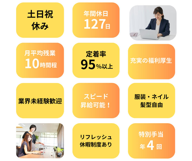休日休暇 完全週休2日制/土・日・祝日 【年間休日】 127日以上 【有給休暇】 入社後3ヶ月経過時点で、有給休暇を付与いたします (法定基準よりも早いタイミングで取得可能です) 【休暇制度】 ・有給休暇 ・GW休暇 ・夏季休暇 ・年末年始休暇 ・慶弔休暇 ・出産休暇 ・フェミナス休暇 ・キッズデイ休暇 ・リフレッシュ休暇(勤続3年以上) ★各長期休暇は5日~7日以上取得可! ★残業が無く、有給取得がしやすい環境なのでプライベートも充実!