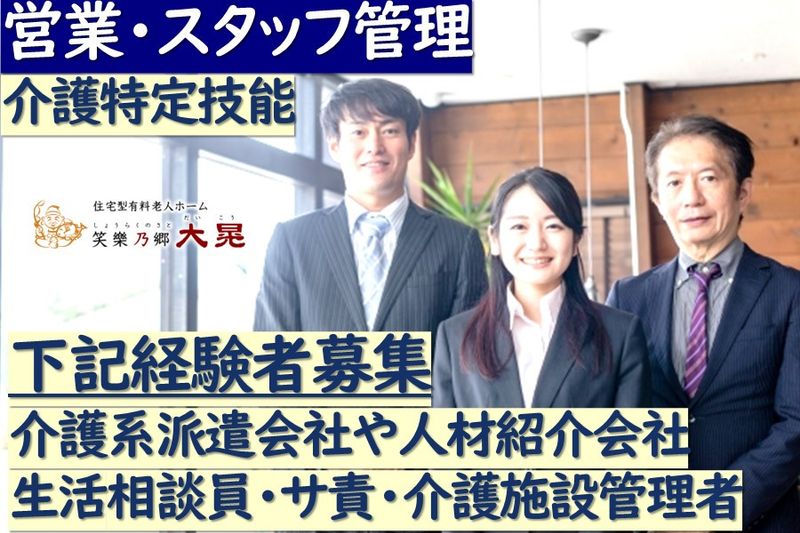 【仕事内容】 介護特定技能の外国人スタッフの管理兼営業のお仕事をお任せします! 語学力は不問です!業界未経験の方も歓迎です! 生活相談員や、サービス提供責任者、管理者、施設長などの現場管理の経験の他、 介護系の派遣会社や人材紹介会社などの人材関連のお仕事、HR系のお仕事のご経験が活かせます! ■具体的なお仕事内容 ・営業活動(新規に特定技能を受入ていただける施設・法人の開拓) ※メールや対面の営業を組合せて行っていただきます。進捗管理もお願いします。 ・技能実習制度などの提案 ・ご提案した外国人スタッフの面接日程などのスケジュール調整・サポート ・外国人スタッフの管理、フォロー ・外国人スタッフの入国前および入国時のサポート ・書類作成 など ■特定技能とは 日本の深刻な人手不足の状況に対応するため、一定の専門性・技能を持った即戦力となる外国人を受け入れることを目的とした制度です。 介護業界は、人材確保が深刻化しており、特定技能の外国人による人材採用は今後ますますニーズが高まる事業になります。 ■大晃サービスについて 大晃サービスは、「笑樂乃郷(しょうらくのさと)」ブランドで、有料老人ホームや訪問介護・訪問看護事業を岐阜県羽島市で展開しています。 2024年7月には、大垣市に「住宅型有料老人ホーム 笑樂乃郷 大晃 おおがき」をオープン。 特定技能事業は今後更なる発展に寄与する重要事業と考えています。 ■お仕事について 外国人の方を中心にサポートしていただくお仕事になっていますが、英語が話せないという方でもOK。 国外の方とコミュニケーション取りながら仕事がしたいという方や異職種からの転職を考えている方など新しい事に挑戦してみませんか? 営業のご経験がない方も、生活相談員や、サービス提供責任者、管理者、施設長などの現場管理の経験が活かせる仕事です。 仕事内容や働き方についてのご質問や施設・法人の見学希望も大歓迎です。 ホームページをご覧になりたい方は、「大晃サービス」で検索してみてください。 お気軽にお問合せ・ご応募お待ちしております! 入職時期が2、3ヶ月後の方も遠慮なく、施設見学承っています。先ずはメールでお問い合わせ下さい。