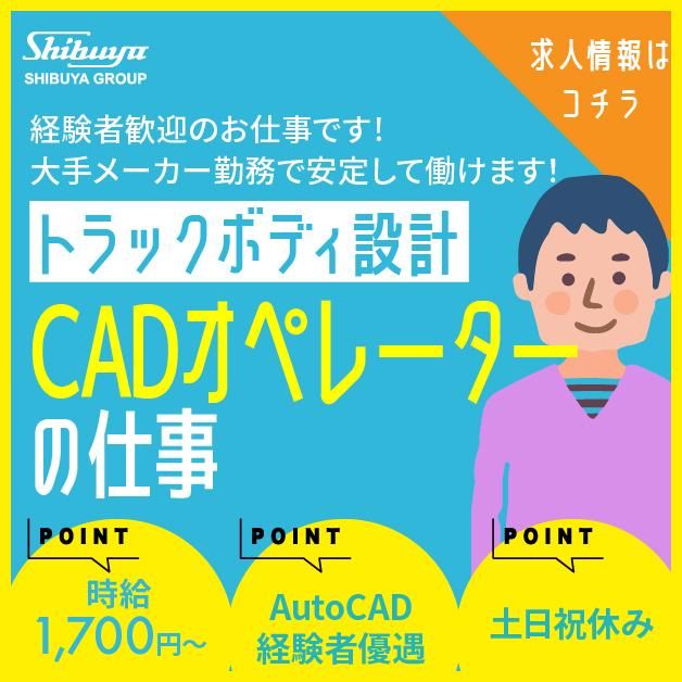 仕事内容 大手トラックボディ製造メーカーでの設計業務となります。 ○勤務地は白山市です。 ○CAD(Auto CAD)を使用して、トラックボディの設計業務をしていただきます。 顧客と営業との間で製品の仕様が決められ、その仕様書に沿ってPCソフトを用い設計図を作成していく業務です。 実務経験豊富で経験のある方大歓迎ですが、経験が浅くてもやる気のある方のご応募をお待ちしています! 現在20代・30代・40代の方が活躍中の職場です。 長期で安定して働きたい方や、モノづくりが好きな方、残業でしっかり稼ぎたい方におすすめです。 土日はしっかり休むことができ、年末年始、ゴールデンウィーク、お盆には長期休暇があるため、プライベートと両立して働くことができます。 勤務地は白山市に位置しており、近隣でのお仕事を探している方にはぴったりです。 【シブヤEDIの想い】 「人と人・人と企業のいい出会いをつくりたい」という想いのもと私たちは2004年に澁谷工業株式会社100%出資のシブヤEDI(いい出会い)という会社を設立しました。「仕事に求めること」はひとりひとり違います。話を聞いたり、実際に見学をしてみると、イメージとは違う世界とのいい出会いがあったりします。ひとりひとりに寄り添って、お仕事と人生について親身になって考えます。 石川県金沢市を中心に白山市・野々市市・河北郡津幡町・かほく市の地域に密着し、澁谷工業グループ会社ならではの充実した福利厚生で安心してお仕事が出来ます。 【シブヤEDIで働くメリット】 ・MERIT 01 働き方を自分で決められる 勤務地、勤務時間、 就業期間など、働き方に対する条件を自分で選択することができます。ライフスタイルに合わせてプライベートの時間を確保するなど、自分にぴったりの働き方を見つけましょう。 組み立て(組立)・配送・フォークリフト・ピッキング・軽作業から、溶接・機械・電気設計・金属加工など手に職をつけられる安定した製造業のお仕事も充実。 ・MERIT 02 経験を活かしながらスキルアップ 仕事の守備範囲や責任分野が明確であり、これまでに自分が身に付けている資格や経験、技術を存分に活かすことができます。営業や事務、CADなどオフィスでのお仕事もあります。また、身に付けたいスキルを好きな期間で学ぶことができる為、将来の独立や転職を見据えての経験に役立ちます。 ・MERIT 03 相談する相手がいる お仕事上の不安やお悩みは、ひとりで考えず担当者にいつでも相談できます。 派遣先企業との間に立ちサポートさせていただき、あなたに合ったキャリアプランを一緒に考えていきましょう。一人では思いつかなかった可能性や解決策も見つかるかもしれません。 一般人材派遣事業(派17-300007) 雇用形態:派遣社員 派遣方式:労使協定方式