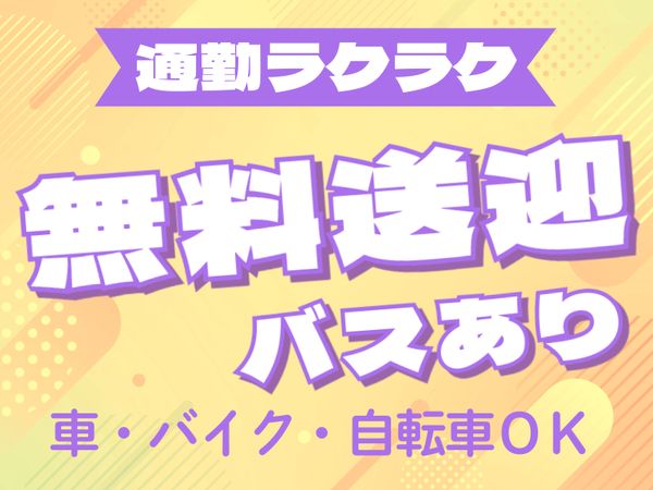 【保険制度】 雇用保険、労災保険、健康保険、厚生年金 待遇 ■日払いOK(規定有) ■交通費規定支給 ■バイク・自転車・車通勤OK ■無料送迎バスあり ■履歴書不要