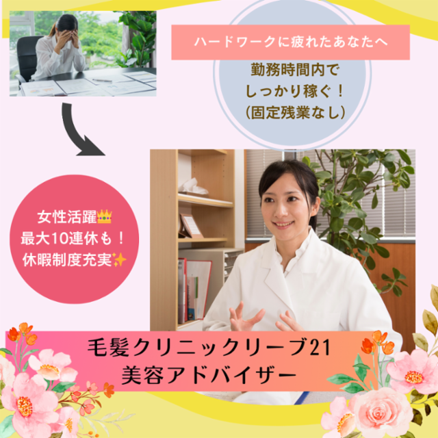 仕事情報 ● 仕事内容 ・お客様の髪や頭皮の悩みを丁寧にヒアリング ・サロン内でのカウンセリング・施術提案・フォローアップ ・店舗メンバーと協力し、売上・サービスの向上を目指します ~質の高い独自のトータルケアサービスをカウンセラーとして提供。実績やスキルに応じて、マネージャーへのステップアップが可能です。~ 1年に1度最大10連休が可能 ★年1回のリフレッシュ休暇あり 毎年 5~10連休のリフレッシュ休暇 が取れます。 有休と公休を合わせて、スケジュールは相談して決められるので「友だちや家族と予定を合わせたい」「旅費が安い時期を狙って海外旅行に行きたい」そんな希望もOK! しっかり休んで「また頑張ろう!」というエネルギーにつながります。 明確な評価・昇格制度 ★3ヶ月ごとに昇給のチャンス!! 新規契約金額+店舗の売上目標の達成状況が給与に反映※(個人ノルマ無)また半年ごとの新規契約金額累計に応じてインセンティブの支給があります(例5~20万円) ★キャリアステップ 勤続年数に関わらず複数店舗を運営、スタッフ育成をするマネージャーにキャリアアップが可能です。 しっかり休める環境 リーブ21では 年間休日114日、完全週休2日制に加えて、春休み・夏休みの特別休暇があります。 ▼春休み(4~6月)に3日 ▼夏休み(7~9月)に2日 休暇を公休とつなげて 4~5連休 にしているスタッフもたくさん。取得時期はチームで相談して決められるのでアレンジも自由です。 働きやすさに自信あり ◎「ホワイト企業」認定取得企業 ◎厚生労働省・子育てサポート企業「くるみん」取得 ◎厚生労働省・女性活躍推進企業認定最高ランク取得 ◎女性活躍リーディングカンパニー2つ星獲得 ◎産休育休取得率100%・平均勤続年数9.09年 ◎中途採用比率9割・未経験入社7割 ◎有給休暇消化率2024年度77%