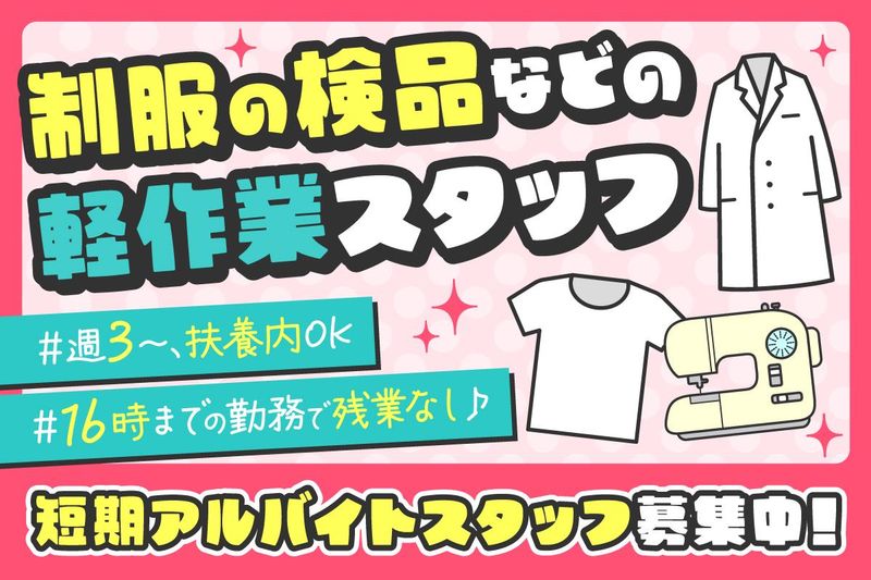 仕事内容 ☆☆☆☆☆☆☆☆☆☆☆☆☆☆☆☆☆☆☆ 2026年2月~4月までの短期スタッフ募集 ☆☆☆☆☆☆☆☆☆☆☆☆☆☆☆☆☆☆☆ ✅ 週3日~&16時まででOK ✅ 土日祝休みで家庭と両立しやすい ✅ 空調完備のキレイな職場 ✅ 座り仕事メインでラクラク ✅ お手伝いメインの超・かんたん作業 / ✨未経験でもすぐできる!人気の軽作業! \ 「次の仕事までの“つなぎ”を探している」 「久しぶりに社会復帰したい」 「家事や育児の合間にちょっとだけ」 >> そんな思いを持っている方必見★ 【どんなお仕事??】 ◆商品チェック(汚れ・ほつれ等の確認) ◆袋詰めや梱包 ◆仕分け・ピッキング など 新品の白衣や制服を扱う軽作業! 主に、すでに働いているスタッフさんの サポートだからすぐに覚えられます(^^)/ お仕事は気さくな先輩スタッフが 丁寧にお教えするので、 不安なくスタートしていただけます! 子育てで一度は職場を離れた方、 ブランクのある方なども活躍中です! ミシンやPCを使う作業は 「できる人だけ」お願いしますので、 もちろん、できなくても大丈夫です!! ━━━━━━━━━━━━━━━━━ ▼ お電話での応募も大歓迎です ▼ ━━━━━━━━━━━━━━━━━ 【03-3967-1188】採用担当まで 「求人を見た」とお伝えください♪ まずはお気軽にご応募お待ちしています!