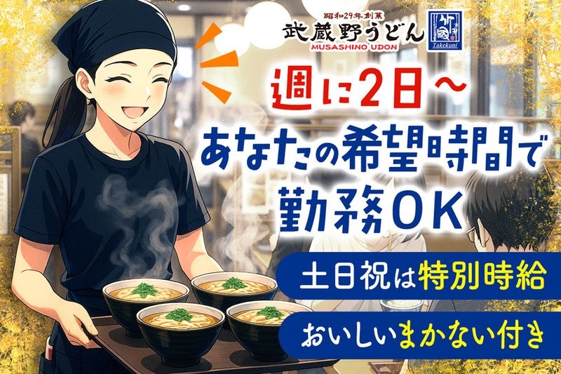 【保険制度】 労災保険 【加入保険】 社会保険(労災保険) ※勤務条件により加入保険が異なります。 【福利厚生】 ・昇給制度あり ・制服貸与 ・交通費規定支給 ・車・バイク通勤OK ・社員登用制度あり ・スタッフ紹介制度あり (紹介者には1万円 紹介された方にも5千円) 【美味しいまかないあり】 湯気立つ打ちたての麺、出汁の香りにほっと心がほどける――。まかないで味わえるのは、お客様にも提供する、お店自慢の武蔵野うどん。 モチモチの食感とやさしい出汁の旨みで、お腹も心も満たされます。美味しさが分かるから、接客時にも自信をもって説明&おすすめできます。