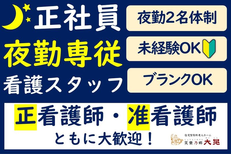 【仕事内容】 住宅型有料老人ホーム(34床)の夜勤専従の常勤看護スタッフ募集! ✅夜勤は2名体制で安心! ✅介護施設未経験、ブランクある方も大歓迎です! ✅年間休日120日以上!プライベートも充実! ■具体的な仕事内容 住宅型有料老人ホームでの夜勤専従のお仕事をお任せします。 ・看護業務 ・利用者様の巡回と安否確認 ・介護看護記録 ・起床時の介助やお手洗い誘導 など 先輩スタッフが一から丁寧にサポートします。 2名体制で夜勤を行うため、確認しながら業務を覚えていただくことが可能です! ■ナーシングホーム笑樂乃郷 大晃(しょうらくのさと だいこう) 大晃グループでは、介護・看護・事務すべての職種で有給休暇が「半日単位」から取得可能です。 お子さまの学校行事や急な用事にも合わせて柔軟にシフトを調整できるので、子育て中の方も安心して働けます。 また、私たちの合言葉は「助け合い・支え合い」。 スタッフ同士が自然とフォローし合える風土があり、実際に多くの子育て中のママがイキイキと活躍しています。 ■いきなりの面接は不安な方には施設見学も大歓迎です! 働き方の相談や、仕事内容のご質問などのお問合せもお気軽にご連絡ください。 入職時期が2、3ヶ月後の方も遠慮なく、施設見学承っています。先ずはメールでお問い合わせ下さい。 ✅もっと詳しく知りたい方は、「 大晃サービス 」で検索ください! 【求人ID-DKS2】
