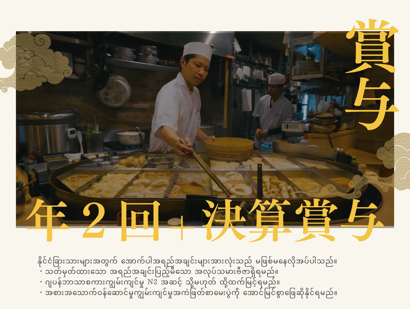 求めている人材 ★外国の方は以下の全てのスキルが必須となります。 ・特定技能ビザ取得者 ・日本語レベルN2以上 ・外食試験合格者 飲食・接客・販売の経験を活かしたい方、大歓迎! 未経験から店長を目指したい方ももちろんOK◎ ★Iターンも歓迎★ 引越代の負担実績もあります! <<< こんな方は尚歓迎◎ >>> ・プレイヤーだけでなく、店舗運営にも関わりたい方 ・裁量ある環境でチャレンジしたい方 ・将来は店長以上のポジションを目指したい方 ・安定した会社で長くキャリアを築きたい方 ・スタッフ育成やチームづくりに興味がある方