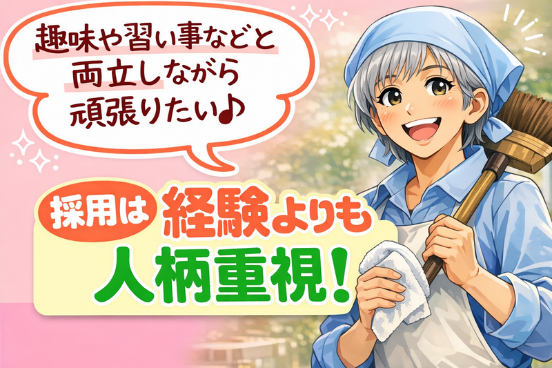 求めている人材 - 採用は、経験よりも人柄重視! まずはご応募ください♪ - 【未経験・初心者OK・ブランクOK】 ✅家事の延長感覚でできるお仕事を探している方 ✅体に無理なく、長く続けられる仕事を希望される方 ✅明るく挨拶ができる方 ・清掃のお仕事が初めてでも大丈夫 ・子育てが落ち着いてから始めた主婦・主夫さん多数 ・久しぶりの社会復帰の方も活躍中 ●丁寧な研修があるので、 「覚えられるか不安…」 「ブランクが長くて心配…」 という方も安心してスタートできます。 ●年齢や経験よりも まじめにコツコツ取り組める人柄を大切にしています。 性別の条件と理由:女性歓迎(ポジティブアクション)