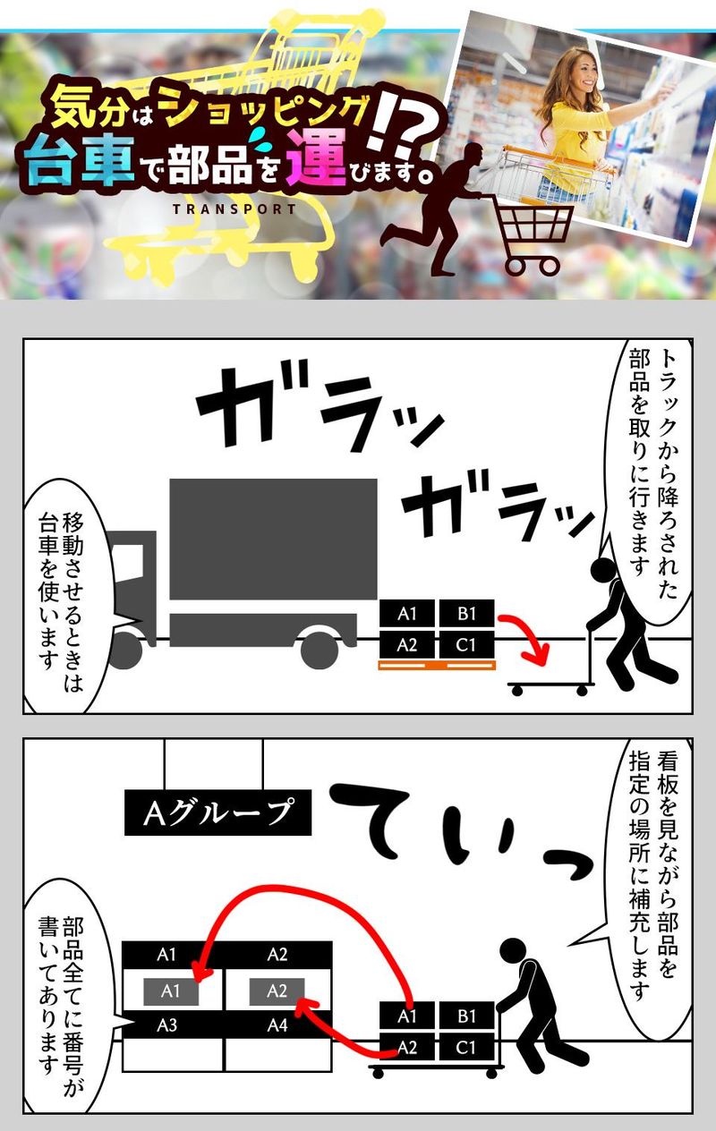 仕事内容 \部品の運搬・補充スタッフ募集!/ トラックで届いた部品を 台車に載せて、工場内の指定場所へ運ぶ作業です。 その後、部品の補充作業をお願いします◎ ✅ 空調完備の屋内作業 ✅ 工場外への作業は一切ナシ! 作業の流れ 1. 台車で部品を取りに行く 2. 指定された箱に、部品を集める 3. 部品を箱ごとラインに流す これを繰り返すだけのシンプル作業です♪ \作業しやすさのポイント/ 大きな看板があり、 どこに運ぶかすぐに分かります◎ 補充場所には番号の表示もあるので、 間違えにくくて安心♪ 慣れてくると、看板を見なくても スムーズに運べるようになります! 棚には便利な液晶表示つき! ・「何個入れるか」 ・「どの色の箱に入れるか」 画面で表示されるからとってもわかりやすい! 終わったらボタンを押すと、 次に入れる棚が光ってお知らせしてくれます◎ ✅ 部品は軽めで扱いやすい ✅ キャスター付きの台車で移動ラクラク ✅ 力仕事は少なめ!体への負担も少ないです♪ 未経験の方にもはじめやすいお仕事です◎ 気になった方はぜひご応募ください! \契約期間の定めあり/ 契約更新あり。 契約期間は上限3年。 契約期間満了時の 業務量や勤務成績を考慮し、 契約更新を判断します。 *** ※業務内容の変更範囲:会社の指定する全業務