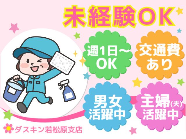 仕事内容 【週1日~OK!】 男女ともに活躍中! パート・アルバイト募集! 直行直帰のお仕事! 勤務開始日の相談OK! 【清掃スタッフのお仕事】 お客さま先のお掃除 (床の掃除機掛けやモップ掛け、ゴミ回収、机拭き上げ、トイレ清掃)を行っていただきます! 1現場あたりの勤務時間 ①9:00~12:00(月、火、水、木、金) ②13:00~15:00(月、火、水、木、金) ③9:00~15:00(月、火、水、木、金) 詳しくはお問合わせくださいませ。 ダスキンで働きながら ご家庭でも活かせる お掃除の技術を磨きませんか? 【清掃未経験者もOK】 先輩社員が同行し丁寧に教えます! 未経験から始めた方も多数活躍中です! 【活躍中のスタッフ】 ・主婦(夫)の方 ・中高年、シニア世代 ・清掃未経験の方 ・お掃除スキルを活かしたい方 【こんな方にもおすすめ!】 ・お掃除が得意な方 ・清掃経験がある方 ・短時間で働きたい方 【ダスキンについて】 コロナ禍によって衛生管理への 意識が大きく様変わりしました。 お掃除を通して、衛生的な環境を 維持するお仕事をしています。 【コロナ対策】 ・出社時検温、うがい、手指消毒の徹底 ・常時オフィス内の空間除菌 清掃のお仕事に興味のある方は、 経験・未経験問いませんので お気軽にお問合せください。