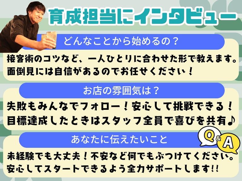 職場環境 20~30代の若手を中心に、お店を盛り上げています。 安定して働ける基盤があるからこそ、いろいろなことに安心してチャレンジすることが可能! 将来的なキャリアプランもどんどん相談できますよ。
