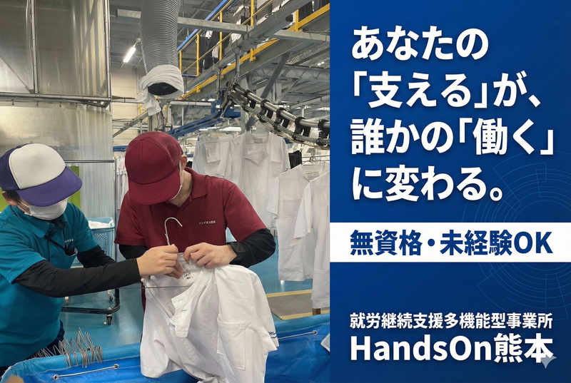 仕事内容 就労支援事業所で、障がいを持った利用者様に 白衣・布団のクリーニングを通して 職業支援のサポートを行います。 【多機能型事業所 HandsOn熊本をご紹介】 障がいのある方の一般就労実現を目指し、 就職活動から就職後までトータルサポートする 就労継続支援A型・B型の多機能型事業所 「HandsOn(ハンズオン)熊本」を運営している当社。 *布団やタオル・白衣の洗濯 *布団やタオルのたたみ作業 *ユニフォームハンガーアップ作業 といった作業を通して、 利用者様の職業支援を行っています。 今回は、私たちと一緒に 利用者様のサポートを行ってくださる方を募集! 普通免許(AT限定可)さえお持ちなら、 経験不問&無資格OKです。 人の役に立てる仕事に興味がある方は、 ぜひご応募ください! 【「ありがとう」がダイレクトに聞ける仕事】 職業指導員とは、障がいを持つ方が働くために 必要な知識・技術を習得できるように 支援するポジションです。 一口に“障がい”と言っても、 その特徴は十人十色。 利用者様それぞれの今現在の 心身の状態はもちろん、 好きなこと・苦手なこと・向いていること・ やってみたいことなどをしっかりと踏まえ、 その人に合う支援を行います。 *利用者様の成長を間近で見られる *一緒に自分も成長していける これが、この仕事の大きな魅力です! 「作業ができるようになった!」 「あなたのおかげで楽しいよ、ありがとう」 利用者様から感謝の言葉を いただけると感無量ですよ。 【人の役に立てる仕事がしたい方を歓迎!】 現在、「HandsOn熊本」では12名の職員が 44名の利用者様と一緒に働いています。 30代6名、40代1名、50代5名と 幅広い年代がバランスよく在籍しているので 中途入社の方もスムーズに慣れていただけるはず。 元介護、元サービス業など前職もさまざまですが 全員に共通しているのは 「人の役に立てる仕事がしたい」「福祉関連に興味がある」 という志望動機です。 もしあなたが同じ思いを持っているなら きっと大きなやりがいを感じつつ働けると思います。 この仕事で活きるのは「コミュニケーション力」。 人と人のコミュニケーションを重ねながら あなたらしく活躍してください!