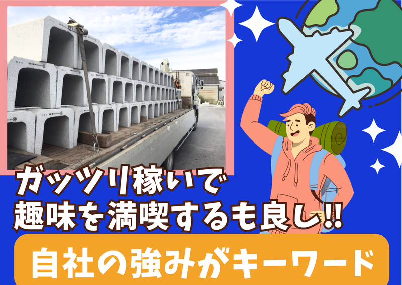 求めている人材 ★ガッツリ稼ぎたい方大歓迎★ しっかり稼いで趣味の海外旅行~♪ なんて働き方もOKです! しっかり稼ぎたい方にピッタリなお仕事です。 ◎経験・学歴不問 ◎要普免(AT可) ✅全くの未経験でOK! 興味とヤル気があれば育てます。 ✅もちろん大型免許の取得も 応援します!(費用を全額会社負担) ✅人柄採用! 元美容師、元介護士など 全くの未経験からスタートした 先輩たちが活躍中です! ◎第2新卒者、フリーターから正社員 目指す方も大歓迎です! ◎次の資格をお持ちの方、優遇します。 ・大型自動車第一種免許 ・フォークリフト免許 ・小型移動式クレーン運転技能講習 ・玉掛け技能講習