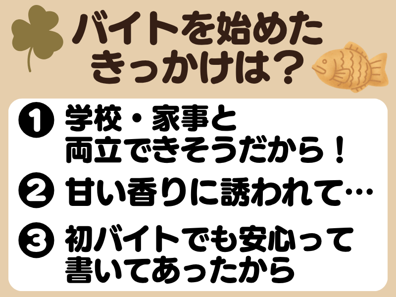 仕事内容 ★\学校帰りや副業にピッタリ♪/★ 未経験OK!たこ焼き・たい焼き専門店 「天たこ・あんたろう」スタッフ募集! ━━━━━━━━━━━━━━━━━ 外はカリッ♪中はトロッ♪ 甘〜いたい焼きの香りも♡ ━━━━━━━━━━━━━━━━━ 17:00~20:30勤務できる方大歓迎! 学校帰りや副業で働きたい方にピッタリ♪ 学生さん・フリーターさん中心に活躍中で、 初めてのアルバイトにも安心の環境です✨ ⋆⸜ スキマ時間で働ける♪ ⸝⋆  ̄ ̄ ̄ ̄ ̄ ̄ ̄ ̄ ̄ ̄ ̄ ̄ ̄ 「学校終わりにそのまま勤務」 「本業終わりに副業として」 「短時間で効率よく稼ぎたい」 そんな働き方が叶います◎ ╭━━━━━━━━━━━╮ *働きやすさpoint♪* ╰━━━━━v━━━━━╯ ✔ 17:00~20:30の短時間勤務♪ ✔ 週2日~OK!3時間30分だけ☆ ✔ 学校・本業との両立OK◎ ✔ 土日だけの勤務もOK! 予定に合わせながら、 ムリなく続けられる環境です♬ 【お仕事内容】 たこ焼き・たい焼きの 調理&販売をお任せします! ▶具体的には… ・生地を流して具材を入れて焼く ・焼き上がった商品をパック詰め ・レジ対応&商品のお渡し \シンプル作業で安心♪/ たこ焼きは「くるっ」と返すのがコツ◎ たい焼きもすぐに慣れる簡単作業です! 丁寧なマニュアルや 先輩のフォローがあるので、 未経験の方でも安心してスタートできます☆ ▶ 学校帰りに働きたい学生さん ▶ 副業・Wワークで収入を増やしたい方 ▶ 短時間で効率よく稼ぎたい方 ▶ 接客や人と話すことが好きな方 学生・フリーターさん多数活躍中の、 明るくあたたかい雰囲気のお店です♪ まずはお気軽にご応募ください✨