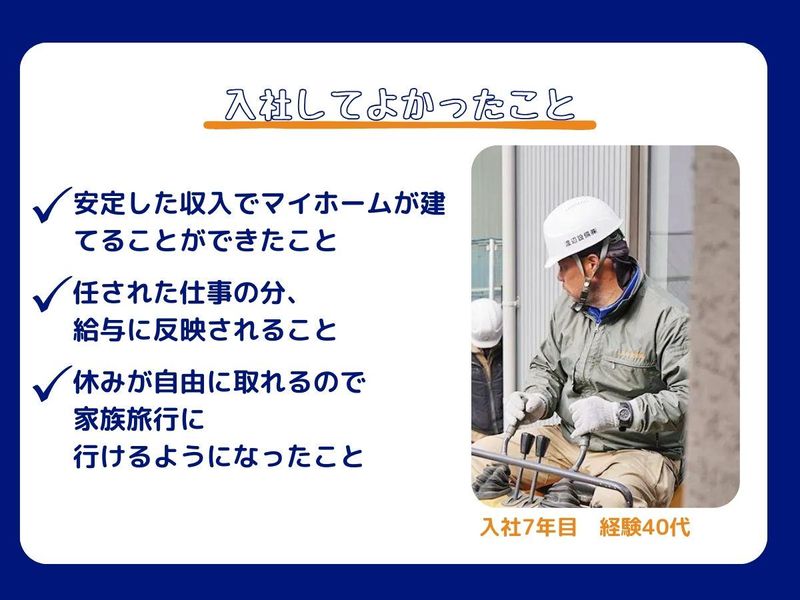 仕事内容 ✅月給35万円最低保証!年収600万も可能! ✅“親方文化”なし!多くが転職で入社! ✅有給取得率高め✨残業も平均8時間 【⭐配管の流れは「家」と「街」の命綱】 私たちが手がけるのは、 新築戸建て住宅における 給排水設備の引き込み・設置・修理・メンテナンス工事。 蛇口をひねれば水が出る。 その“当たり前”を支えているのが、 私たちの仕事です。 水道工事は水道法に基づく 公共性の高いインフラ工事。 景気に左右されず、仕事が途切れることはありません。 【⭐経験者だからこそ、 待遇でしっかり応えたい】 現場経験をお持ちの方には、 月給35万円以上を最低保証。 ・月給35万〜38万円スタート ・年収600万円超の実績あり ・昇給年1回/賞与年2回 「現場を任されているのに給与が上がらない」 「忙しいだけで評価されない」 そんな経験をしてきた方にこそ、 納得できる条件でお迎えします。 【✅具体的な仕事内容】 三河エリア(岡崎・西尾・蒲郡・幸田)を 中心に、新築戸建住宅の 水回り配管工事を担当していただきます。 <具体的には> ・給排水配管の引き込み、設置工事 ・床下・壁内での配管取り付け ・図面の確認、材料手配、段取り ・現場での状況判断 ・社用車での現場移動 基本はペア作業。 現場数を詰め込みすぎることはなく、 無理のない工程で仕事ができます。 【⭐“親方文化”のない、フラットな現場】 中途入社の社員がほとんどで、 年齢や社歴に関係なく、 現場ではフラットに協力する文化です。 ・人間関係がギスギスしない ・無駄な書類仕事が少ない ・現場作業に集中できる 経験者の方ほど、 「働きやすさの違い」を実感しています。 【⭐家庭も仕事も、どちらも大切に】 有給は取りづらい雰囲気は一切なし。 運動会や卒業式などの家族行事も、 当たり前に参加できます。 実際に、 持ち家を建てた社員や、 家族との時間を大切にしながら 長く働いている社員が多数。 「この先も、無理なく現場に立ち続けたい」 そんな方に、ちょうどいい環境です。