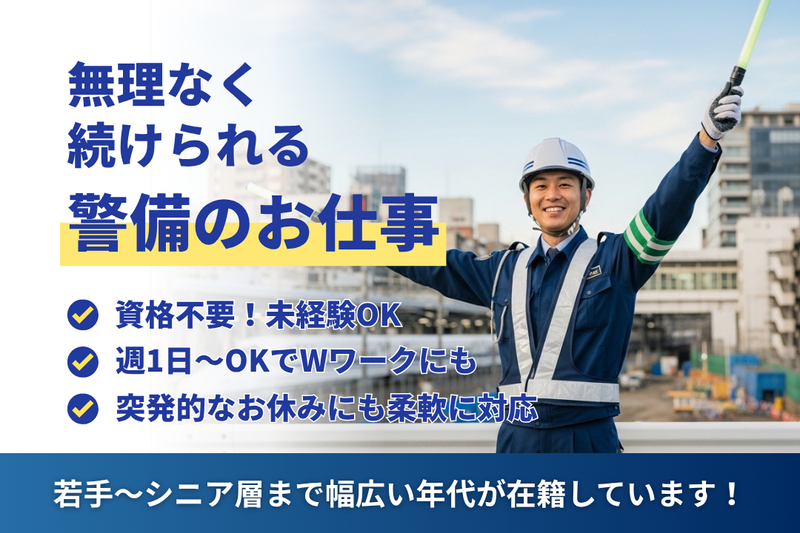 仕事内容 ✨日給14,000円可!立って案内するだけのシンプル警備✨ \週1日~OK×未経験歓迎!すぐ働けてすぐ稼げる/ 「難しい仕事は不安…」 そんな方でも安心して始められるお仕事です。 お任せするのは、 歩行者や車に「こちらどうぞ」と声をかけるだけ! 複雑な作業や専門知識は一切ありません。 実際に未経験から始めた方がほとんどで、 20代~60代まで幅広いスタッフが活躍中。 研修もあるので安心してスタートできます! 【お仕事内容】 とてもシンプルな交通誘導のお仕事です。 ✅ 歩行者や車両のご案内 ✅ 「止まってください」の声かけ ✅ 周囲の安全確認 すぐに覚えられる内容なので、 初めての方でも無理なく続けられます◎ 【ここがポイント】 ✨ 日給14,000円も可能でしっかり稼げる ✨ 日勤のみ(8:00~17:00)で生活リズム安定 ✨ 週1日~OK!副業・Wワークにも最適 ✨ 突発的なお休みにも柔軟対応 ✨ 髪型・ヒゲ自由で気軽に働ける 履歴書不要&WEB面接OKで応募もカンタン♪ 「すぐ働きたい」 「シンプルな仕事で稼ぎたい」 そんな方にピッタリのお仕事です。 まずは気軽にご応募ください✨