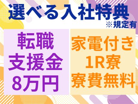 【保険制度】 雇用保険、労災保険、健康保険、厚生年金 待遇・福利厚生 【福利厚生】 ・社会保険完備 ・交通費規定支給 ・週払い制度あり(規定) ⇒実稼働分の6割程度が上限目安 ・賞与年2回 ・賞与あり ・社員食堂完備(1日1食『無料』) ・個人ロッカー完備 ・空調完備 ・喫煙所ルームあり ・退職金制度あり ・ワンルーム寮完備 ⇒冷蔵庫・洗濯機・TV・エアコンなどの家電付き