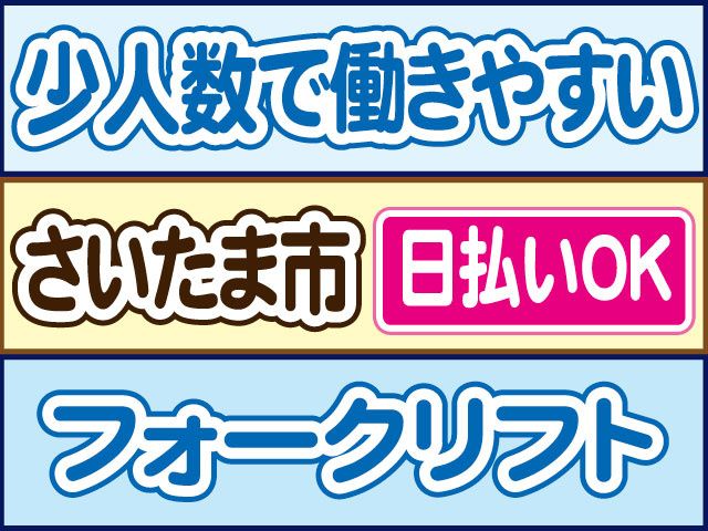 仕事内容 人気な企業なので入社決まり次第終了 即日勤務・事前見学OK、50代中高年も活躍中 カウンターフォークで座り作業、経験の浅い方もOK 「フォークリフトスタッフのポイント」 〇資格を活かせる 〇高時給1,400円スタート 〇22:00以降は時給1,750円 〇夜勤 〇週休二日制、大型連休あり 〇20代30代40代50代の男女活躍中 〇少人数で働きやすい職場 〇日払いOK(規定内) 〇履歴書不要 〇交通費支給(規定内) 〇「マイリク定着支援」導入企業 【フォークリフトスタッフの仕事内容】 さいたま市桜区にある青果市場でのお仕事 <具体的には> カウンターフォークリフトを使って野菜等の 〇ピッキング 〇運搬 を お願いします。 カウンターフォークなので座り作業でラクラク リーチフォークは乗れなくても大丈夫です サポート体制もしっかりしているので 実務経験が少なくても安心して働けます 職場見学(30分~1時間程度)実施中です 【フォークリフト作業勤務について】 ・夜勤のみ(19時~翌朝4時の実働8時間) ・火・土・祝日休みの週休2日制 ・長期連休もあり 急な発熱・体調不良・冠婚葬祭など 突発的なお休みに柔軟に対応しております。 【こんな経験活かせます!】 下記経験者は前職活かせます。 〇長期アルバイト・パート 〇フォークリフトパート・アルバイト 〇ピッキング・仕分けパート・アルバイト 〇倉庫・構内作業パート・アルバイト 〇物流業界派遣 〇主婦(夫)パート・中高年パート 前職不問で採用しております。 ブランクのある方もOK 経験の浅い方もOK 〇ご不明な点はお気軽にお問い合わせください〇 お電話でのご応募、ご質問も受付中! 株式会社ロフティー 川越支店 TEL0800-222-6888(フリーダイヤル) お仕事情報など採用ページはこちらから https://entori.jp/lofty-kawagoe ハローワークでお仕事探しをされてる方も 是非1度お問合せ下さい コーディネーター・定着支援のWサポート体制導入 「マイリク定着支援」導入企業! アンケートで職場の様子を確認し、 コーディネーター・定着支援担当が連携してサポート。 はじめての派遣でも安心して働けるよう迅速かつ 丁寧にサポート対応いたします。