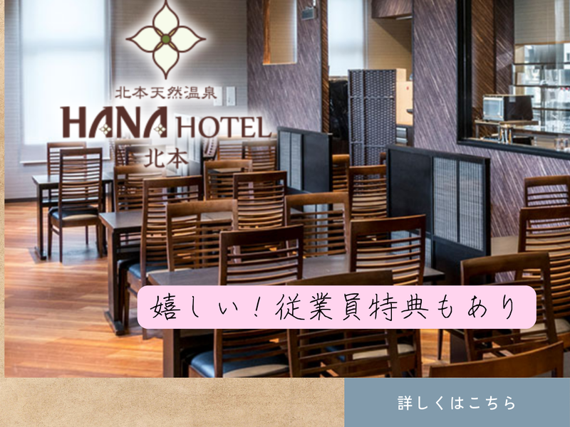 仕事内容 。・*・。。・*・。*・。。・*・。。・* 【温泉・食事・空間】で 癒しをご提供する 「ハナホテル北本」 業務好調につき 正社員を大募集! 。・*・。。・*・。*・。。・*・。。・* 接客・飲食・ホテル業界の経験者大歓迎! もちろん未経験の方もOK! 人柄・やる気重視の採用です。 各部門にパート・アルバイト スタッフがおりますので 皆で協力しながら 楽しくホテルを運営していきましょう! ー <<<<< お仕事内容 >>>>> 〇フロント (チェックイン、チェックアウト) 〇電話対応等のお客様対応 〇予約作成 〇客室管理 〇オンラインサイト管理 〇客室備品管理等 などをお任せします。 *・・*・・*・・*・・*・・*・・*・・*・・*・・ ホテル、温浴施設、ゴルフ場等の 総合レジャーを展開する (株)リゾート花湯の森グループ なので安心して働けます。 嬉しいグループ施設の従業員特典も有!