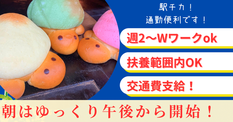 求めている人材 ✅未経験者歓迎 (経験・未経験は問いません!!) 未経験でもできるシンプルな作業 ✅パンに関わる仕事がしたい方 調理のお仕事に興味がある方 趣味感覚で働きたい方 ✅扶養内で働ける 家計の足しにしたい方 ✅大学の授業後に働きたい! 出勤時間の調整も可! 【こんなスタッフ活躍中】 学校給食のお仕事の為、 夏休み等の休業期間は仕事を休み、 子育ても両立させている方! 子供の“食”に関われるお仕事をしたい方! 仕事もプライベートも充実させたい方! パン好きでより多くの方に自分のパンを届けたい方!