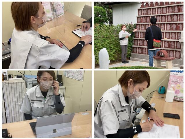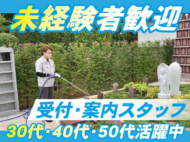 仕事内容 穏やかな環境でひとりで働きたい方におすすめ! お墓の知識は一切不要。未経験から始められる、 永代供養墓・樹木葬の受付案内・管理のお仕事です。 ◆30代・40代・50代の男女スタッフ活躍中! 中高年スタッフも活躍中! 中高年から異業種にチャレンジしたい、そんな方の転職も応援します ◆人に寄り添い感謝される、やりがいあるお仕事! ◆研修制度やサポート体制充実◎未経験でも安心! 【仕事内容】 受付案内:永代供養墓・樹木葬の見学者の受付ご案内 事務作業:お申込み手続き、PC入力、書類整理などの事務作業 管理業務:墓域の清掃、見回り、墓誌の設置、納骨などの管理業務 【一日の仕事例】 08:30[開苑作業] 案内看板やのぼり旗の設置、案内所内の清掃 08:45[墓域清掃・水撒き] 落ち葉などの掃き掃除や除草、樹木葬の木々への水撒き 10:00[受付・ご案内] 見学者にお墓のご説明や納骨までの流れをご案内 主に事前予約をいただいたお客様のご案内となります。 11:00[納骨業務] 納骨場所の蓋を開け、お預かりした遺骨の納め作業 12:00[お昼休憩] 13:00[墓域見回り・清掃] 14:00[墓誌設置作業] 墓誌をお墓に固定(片手で持てる程度の重さ) 墓誌とはお名前が彫刻された石板のことです。 15:00[受付・ご案内] 16:00[事務処理] 日報作成や申込み手続きなどの事務作業 17:00[閉苑作業] 案内看板等の片づけ、案内所の閉め作業 17:30[業務終了] お寺の閉門時間が決まっていることもあり、 残業はほとんどありません◎ ▼業務の一日を動画でご覧いただけます https://youtu.be/Vuu_j4Ba7w0 【研修について】 マニュアルと現地での研修がございます。初めての方もご安心ください。 気軽に質問ができ、意見なども伝えやすい風通しの良い職場です。 誰でも最初は初めてです。少しずつ慣れていけば問題ございません◎ 【働くスタッフの声】 Aさん(40代/入社1年目/未経験) 「お客様から直接感謝の言葉をいただけることが、何よりのやりがいです。 スタッフの皆さんが丁寧にサポートしていただけるので、 未経験からでも安心して仕事に取り組むことができました。 お寺の静かな環境の中、もくもくと作業に集中しながら働けています。」 Bさん(30代/入社3年目/接客経験有) 「接客経験を活かして働きたいと思い、入社しました。 お墓以外にも終活に関する知識を学ぶ機会があり、 覚えることは多いですが新しいことに挑戦することができます。 会社の成長とともに自身も成長している実感を覚えています。」 【お問い合わせだけでも大歓迎】 少しでも気になったという方は、 応募フォームからお気軽にご応募ください!