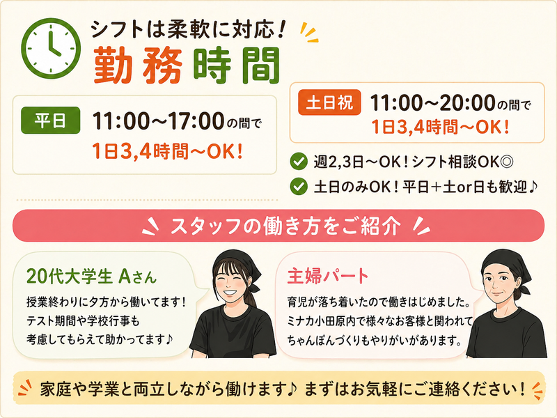 勤務時間詳細 <平日>11:00~17:00の間で 【1日3,4時間~】勤務OK! <土日祝>11:00~20:00の間で 【1日3,4時間~】勤務OK! ★週2,3日~OK ★土日のみなどシフト相談OK◎ ★平日+土or日で働きたい方歓迎✨ =====働き方は選べます===== 週3日~4日で、 家庭や学業と両立しながら働く 主婦さん・学生さんが多数活躍中✨ シフトは柔軟に調整できます◎ あなたのスタイルで働きませんか? ==================