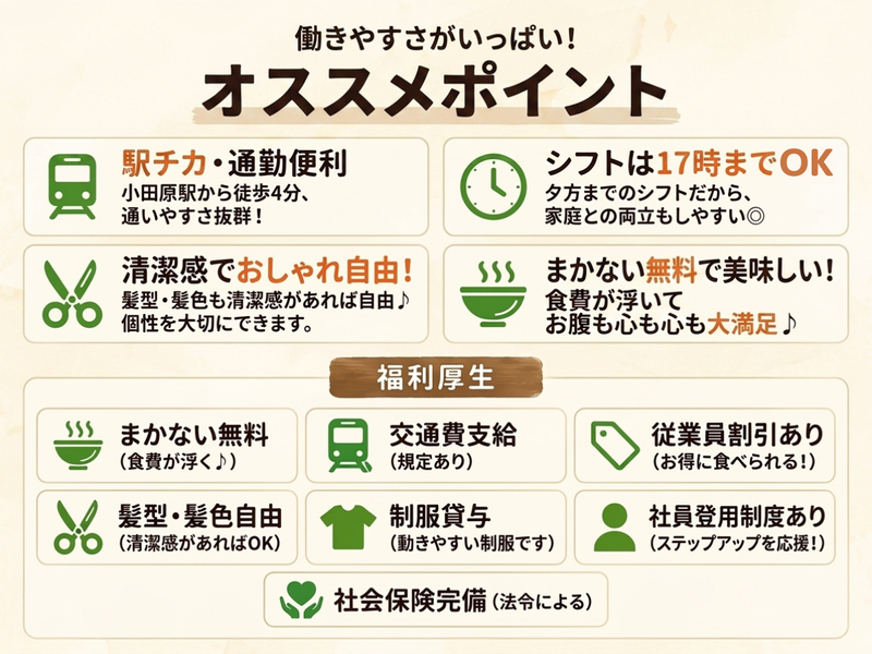 仕事内容 \私生活と両立できる働き方◎/ 「家庭の都合に合わせて働きたい」 「学業終わりにサクッと働きたい」 そんな方にピッタリのお仕事です! <<✨オススメポイント✨>> ✅駅チカだから通勤便利! ✅平日のシフトは17時まで! ✅清潔感があれば髪型・髪色自由! ✅まかない無料で食費が浮きます♪ ✅週2,3日~OK!シフト応相談◎ 【電話応募も大歓迎☎】 ◆電話番号:0465-22-2972◆ ※電話受付/平日9:00~17:00 ✦・┈┈┈┈┈ ・✦✦・┈┈┈┈┈ ・✦ ✨ お仕事内容 ✨ ︶V︶︶︶︶︶︶︶︶ ■カウンター ・お客様のオーダー取り ・カウンター越しの食品提供 ・レジ会計 など ■キッチン ・麺の茹で作業 ・お皿への盛り付け など 初めはご飯系メニューの盛り付けなど 簡単な業務からスタート! レシピやマニュアルがあるので安心! スタッフ同士で楽しく働けます♪ ✨スタッフの働き方をご紹介✨ ︶V︶︶︶︶︶︶︶︶︶︶︶︶︶ <20代大学生Aさん> 「授業終わりに夕方から働いてます! テスト期間や学校行事も 考慮してもらえて助かってます!」 <主婦パート30代> 「育児が落ち着いたので働きはじめました! ミナカ小田原内で様々なお客様と関われて ちゃんぽんづくりもやりがいあります」 まずはお気軽にご連絡ください♪ 面接では希望や条件をしっかり伺います。 じげもんちゃんぽんで一緒に働きませんか? ミナカ小田原内にある賑やかなお店です♪ ご応募お待ちしています!