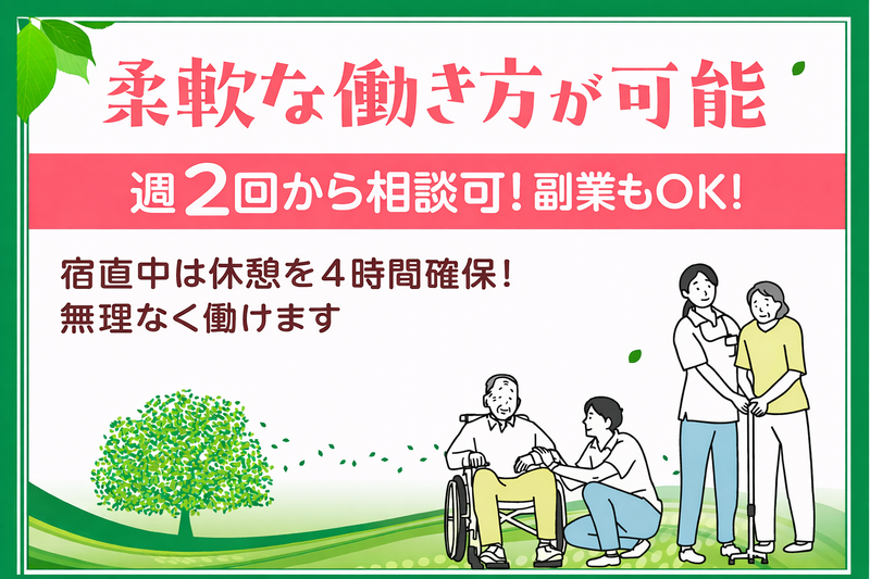仕事内容 *介護経験3年以上の方を即戦力として歓迎! *宿直1回1万4000円~!週2回から相談可能! *正社員登用あり!キャリアアップ可能! *駅徒歩1分!駅チカ好立地で通勤楽々! *無料駐車場完備!マイカー通勤もOKです! //////////////// <電話でのお問い合わせ> 011-792-5213(採用担当)まで //////////////// 【仕事内容】 サービス付き高齢者向け住宅での宿直業務をお任せします。 ~~ 具体的には 〇夕食・朝食時の食堂への誘導 〇服薬管理のサポート 〇おむつ交換などの身体介護 〇安否確認の巡回 〇共有スペースの清掃 など ~~ 入社後について 入社後は先輩スタッフが一つひとつの業務について丁寧にお教えします。わからないことがあれば、近くにいる先輩スタッフに気軽に声を掛けていただければOK!徐々にできることを増やしていきましょう◎ //////////////// 【経験を活かして即戦力へ】 介護職3年以上の経験と初任者研修修了以上の資格があれば、即戦力として活躍可能!介護福祉士や看護師資格をお持ちの方はさらに優遇いたします◎これまでの知識とスキルを存分に発揮できる環境が整っています* 【1勤務14000円の高収入】 宿直1回あたり1万4000円~1万4500円の高水準の給与をご用意!処遇改善手当4800円が含まれており、介護職員の待遇向上に積極的に取り組んでいる職場です◎週2~3日の勤務でも月収11万円以上を実現できますよ* 【週2日勤務から相談OK】 17時から翌朝9時までの宿直勤務で、週2~3日から相談OK!日勤の仕事との両立や、プライベートの時間確保など、ライフスタイルに合わせた働き方を実現可能です◎シフト調整ももちろんOKなので、お気軽にご相談くださいね♪ 【ゆくゆくは正社員として長期安定】 正社員登用制度もご用意しており、過去3年間で1名の実績あり!雇用期間の定めもなく、長期的なキャリア形成が可能です◎昇給制度もあり、前年度は時給換算で50円アップ!スキルと経験に応じた適正な評価を行います◎ 【駅1分!雨雪でも楽々通勤】 勤務地は地下鉄南北線北34条駅から徒歩わずか1分の好立地!雨の日も雪の日も通勤ストレスなし◎無料駐車場も完備しているため、マイカー通勤も可能。通勤手段を選べる便利な環境で、毎日の通勤が苦になりません* //////////////// ~~ 当社について 高齢者が地域社会にとけ込み、安心した生活を送れる環境を創造・提供することを理念に、高齢者住宅運営・訪問介護事業・高齢者住宅食堂運営を展開している「大樹株式会社」。平成20年の設立以来、安定基盤のもとで地域に根差した介護サービスを提供しています。 ////////////////