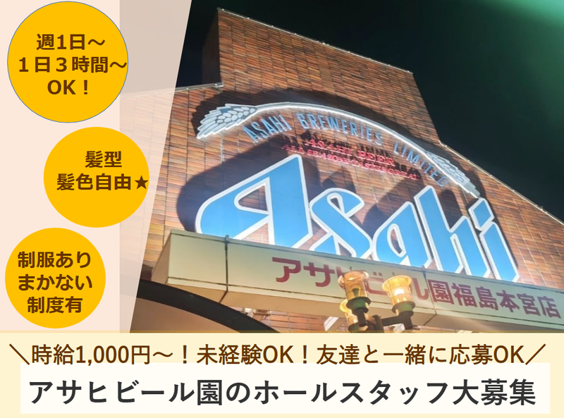 仕事内容 ――――――――――――――――――― ⭐\こんな方、大歓迎/⭐ ――――――――――――――――――― ✅土日のランチ時間に入れる方 ✅土日いずれかでもOK ✅土日だけでもOK ✅もちろん、平日との組み合わせもOK ――――――――――――――――――― ⭐\おすすめポイント/⭐ ――――――――――――――――――― ✅週1日、3時間~OKの希望シフト制 ✅未経験・ブランク大歓迎! ✅副業・WワークOK! ――――――――――――――――――― ⭐\アサヒビール園を紹介/⭐ ――――――――――――――――――― 全国で2店舗だけのアサヒビール園! 観光客から地元の方まで幅広くご来店✨ 工場できたてのビールや 名物ラムしゃぶ・ジンギスカンが自慢のお店です。 県産食材の美味しさをお届けしています♪ 【お仕事内容】 ◆ご注文のお伺い ◆お料理やドリンクのご提供 ◆お会計 ◆後片付け、清掃 など 注文は手書きで伝わるようにメモすればOK! 難しい機械の使い方も覚えなくて大丈夫です◎ 現在活躍中のスタッフさんは 飲食店未経験の方がほとんどです! もちろん、先輩スタッフが横について お仕事をイチからお教えします! できることからスタートしますので 初めての方もご安心くださいね◎ みなさまのご応募を心よりお待ちしております。