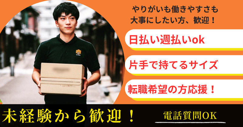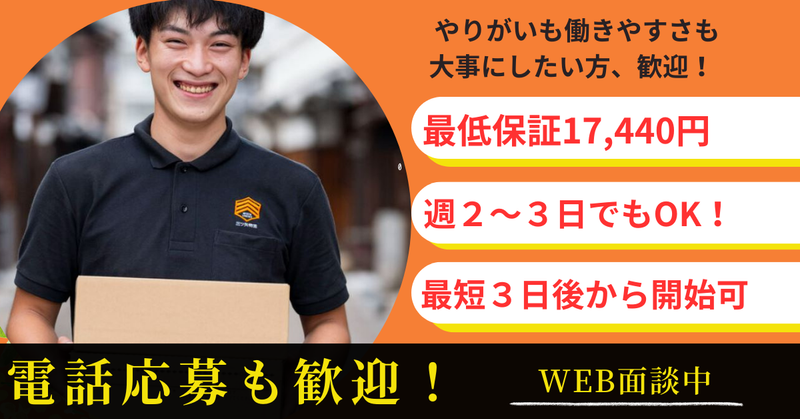 仕事内容 \スピード採用(WEB面談)実施中!!/ ◆━━━━━━━━━━━━━━━━━◇ ╭━━━━━━━━━━━━━━╮ ✨当社はリース代0円!!✨ ✨車は無くても開始可能!✨ ✨1日1万7440円報酬保証✨ ✨日払い・週払いも対応!✨ ✨安心!丁寧なガイダンス有✨ ╰━━━━━━━━━━━━━━╯ ________________ 【 ⏩どんな業務内容ですか? 】  ̄ ̄ ̄ ̄ ̄ ̄ ̄ ̄ ̄ ̄ ̄ ̄ ̄ ̄ ̄ ̄ 大手ECサイトのお荷物を配送 片手サイズ!負担少なめ◎ ✅置き配9割・ポスト投函メイン ✅受取サイン無し・現金授受ナシ! 【エリア】 豊中市の周辺エリア スマホで全て自動ルート設定の為、 道を覚える必要が一切ありません。 [拠点] 豊中市内のセンターから出発 (商品がまとまっているから超簡単) →15分程ですぐ出発! __________ ⏩働きやすさが違う!  ̄ ̄ ̄ ̄ ̄ ̄ ̄ ̄ ̄ ̄ 【週2~3日勤務】から無理なくスタート! 最初は副業から始めた方が、 本業に切り替えて活躍している例も多数! ドライバーさんのペースで選択しています◎ ━━━━━━━━━━━━ ⏩その他の注目ポイント! ━━━━━━━━━━━━ ✅ 定着率が高い 人間関係良し◎働きやすい環境! 1年継続する方が93.6%! ✅ 地理に不安があっても大丈夫! →アプリが道を案内 (超便利機能) ✅ 荷物は軽くて男女問わず活躍! 主婦さんも活躍! __________________ ⏩\配送ドライバーのリアルな声/  ̄ ̄ ̄ ̄ ̄ ̄ ̄ ̄ ̄ ̄ ̄ ̄ ̄ ̄ ̄ ̄ ̄ ̄ 「車がなくても、はじめられた!」 「未経験から始めて、1ヶ月で慣れました!」 「副業から始めて、今は本業になりました!」 「スリーゼロ制度があった三ツ矢さんを選択!」 「リース代が無いから他社から乗り換えました」 「経費が減って手取り15万円上がりました」 ━━━━━━━━━━━━━━━━━━━ 【採用枠は残り3名】 「まずは話を聞いてみたい方」歓迎です! ━━━━━━━━━━━━━━━━━━━ あなたの"やってみたい"気持ちを、 私たちは全力でサポートします。 応募はカンタン30秒! ⏩WEB面談(スマホOK)でスピード選考! ⏩面談は1回! 担当:広告チーム宛 TEL:06-6543-0328(質問もOKです) ━━━━━━━━━━━━━━━━━━━ 弊社HPはこちらです!是非ご覧ください! https://www.mitsuya-log.com/ 【関西エリアで常時100台以上稼働】 ━━━━━━━━━━━━━━━━━━━