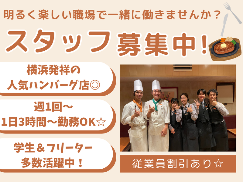 仕事内容 \✨テストやサークルとの両立可能✨/ 飲食未経験やスキルに自信がない方もOK♪ 週2日~、1日3時間~OK★無理なく稼げる◎ まかないや社員割引で自分も家族も友達も お得にハンバーグが食べられます⭐ *:-☆-:*:-☆-:*:-☆-:*:-☆-:* ハングリータイガー保土ヶ谷店で ホール業務をお願いします! 【仕事内容】 ✅お客様のご案内・接客 ✅オーダー取り ✅お料理やドリンクの提供 ✅お会計(レジ打ち) ✅テーブルの片付け など 接客マナーやコミュニケーション能力など 将来の就職活動にも役立つ知識・経験が 自然に身につくお仕事です✨ 特にスタッフの皆でホール全体を 円滑に回せた時の達成感はバツグン! 約50人いる先輩の半数は学生! 同世代のスタッフが多く、 学校以外でも仲間ができますよ⭐ 仕事だけじゃなく学校生活や進路のこと、 就活のことなんかも相談できます★ ―――――――――――――――― ⭐丁寧な研修で着実にスキルアップ⭐ 入社後は、最初の48~60時間を目安に 先輩スタッフがマンツーマンで研修します。 業務を行う中で生じる疑問や不安にも、 しっかりとサポートしますので 飲食業が未経験の方もご安心ください◎ さらにスキルUPしていけば、 将来リーダーになれる事も! リーダーの証である専用の ネクタイやバッジをGETしましょう! もちろん、手当も出します✨ ⭐ハングリーならではの特典⭐ 月に1度お客様としてご来店して頂き、 自慢のハンバーグを無料で食べられます! スタッフ同士で来店し、 コミニュケーションの場としても◎ ご来店して頂く日は出来るだけ 希望を考慮しますよ! ――――――――――――――――