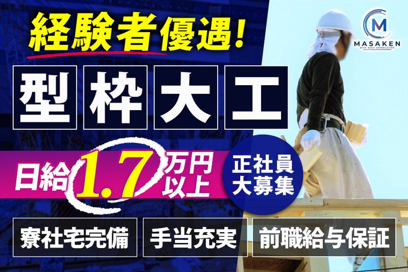 【雇用形態】 正社員 【契約期間】 試用期間2ヶ月(同条件)。その後、正社員のため無期雇用。 【その他】 #経験者歓迎 #有資格者歓迎 #40代以上応募可 #50代以上応募可 #フリーター歓迎 #ブランクOK #学歴不問 #未経験者歓迎 #第二新卒歓迎 【ハローワークへの求人掲載について】 弊社の求人はハローワークに掲載していない案件が多数ございます。(ハローワーク求人掲載は期間が経つと自動的に掲載が止まるため)お気軽にお問い合わせください。 【このような方活躍】 建設、建築業界の躯体作業員(型枠工事、躯体工事、現場作業員、基礎工事、重機オペレーター)で働きたい方。躯体作業員や型枠大工経験者の方。週休2日、寮社宅あり、髪型・髪色自由、ピアスOK、ひげOKの建設企業で躯体作業員として働きたい方。経験者、フリーター、ブランクOK、中卒高卒、中高年層も活躍している職場で働きたい方。躯体作業員として正社員で働きたい方。躯体作業員を新着急募。躯体作業員、正社員、解体、建設業、躯体大工。 求人ID【P-MSK01】