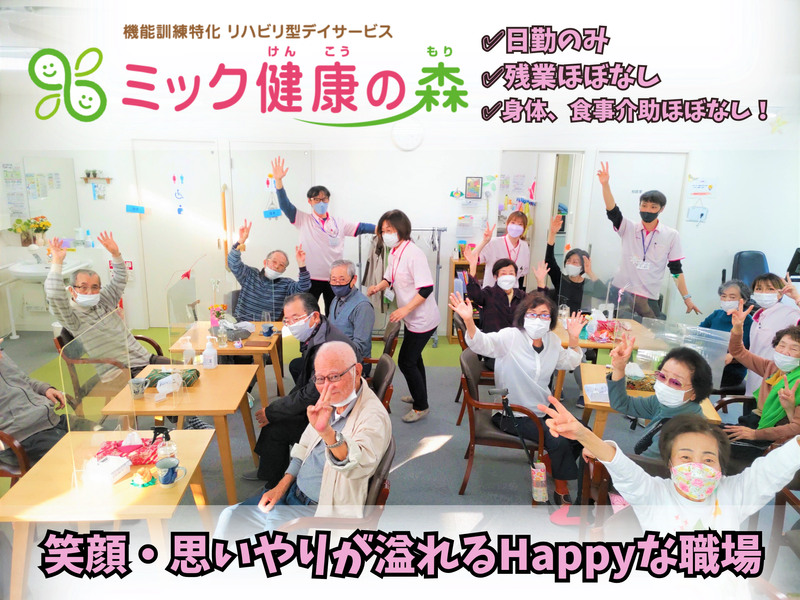 仕事内容 ✅残業ほぼなし&夜勤なし✨ ✅完全週休2日!年間休日118日〜 ✅東証プライム上場会社のグループ会社 ✅プライベートの調整しやすさ◎ ✅身体,食事介助ほとんどなし! ✅車通勤OK!交通費から駐車場代補助まで有! 8時30分~17時30分までのリハビリデイサービスでのお仕事です! <ミックのリハビリデイサービスってどんな所??> ご高齢の方が、心身ともに健康に居れる様に、 会話をしながら、楽しく運動して、 より健康に長く過ごせるお手伝いをしている所です! 楽しく会話や運動が出来るデイサービスなので 笑顔で働く事ができると思います! 1日中介護をするということは無く、 体の負担も少なく、 そしてスタッフもご利用者さんも優しい方ばかりで、 人間関係も良く、 安定して長く働けますよ✨ 3ヶ月に1度ある効果測定により 改善が目に見えてわかったときには 利用者様の笑顔に元気をもらいます。 出来なかった事が出来るようになる姿を見るのはとてもうれしいです。 帰り際に(またね!)と笑顔で言ってくだるその一言に この仕事をしていて良かったなといつも思わされます。 これからもその笑顔がたえることがないよう 努めていける、そんな素敵な職場です! <ミック健康の森の一日の流れ◆> 〜午前と午後×3時間のプログラム〜 [午前][午後] 09:00/13:00 [お迎え] 09:15/13:15 [健康チェック] 09:30/13:30 [準備体操/ストレッチ] 10:00/14:00 [マシントレーニング] 11:15/15:15 [自主トレーニン] 11:30/15:30 [整理体操] 11:45/15:45 [カフェタイム] 12:15/16:15 [お送り] ※施設により時間が前後する場合がございます。 ✨あなたらしく働けます!✨ 髪色・髪型自由、ネイル・ピアスOK ┗ネイルは危険のない範囲でお願いします。 (ヒゲだけ、まだダメです。) <カジュアル面談実施中✨> 気になるコトや不明点など、 お答えしますので、 まずはお気軽にご応募くださいね!! 今後の進め方など、 思いやり溢れるスタッフ達が しっかりとサポートします♪ 「笑顔溢れる空間が好き」 「優しいって言われる」 「思いやり溢れる職場が好き」 そんな方にはとてもおすすめな環境です! 気になった方はまずは お気軽にお問い合わせくださいね♪ <mik japanってこんな会社> 【 社内アンケート結果 】 ##当社で働いていて良いなと思うものランキング## 1, 休日・休暇 2, 職場の雰囲気 3, 労働時間 4, 仕事内容 5, 業務量 / 会社のビジョン・理念・社風 <実際に働いてる方の声> 20代 Aさん 職場の雰囲気が良い、スタッフ同士のコミュニケーションがよく取れています! 30代 Bさん 育児世代には働きやすい環境です。 急な休みも小さい子供がいるスタッフも多く快く対応していただける為助かります 40代以上 Cさん 個人の体調・メンタル面でもチームで補い協力して頂けます。 苦手な業務でも嫌な顔せず何度も教えて頂き、上長に対しての信頼感が増しました。 利用者様からはミックに来たら笑顔になって元気で帰れると言われる事が嬉しいです!