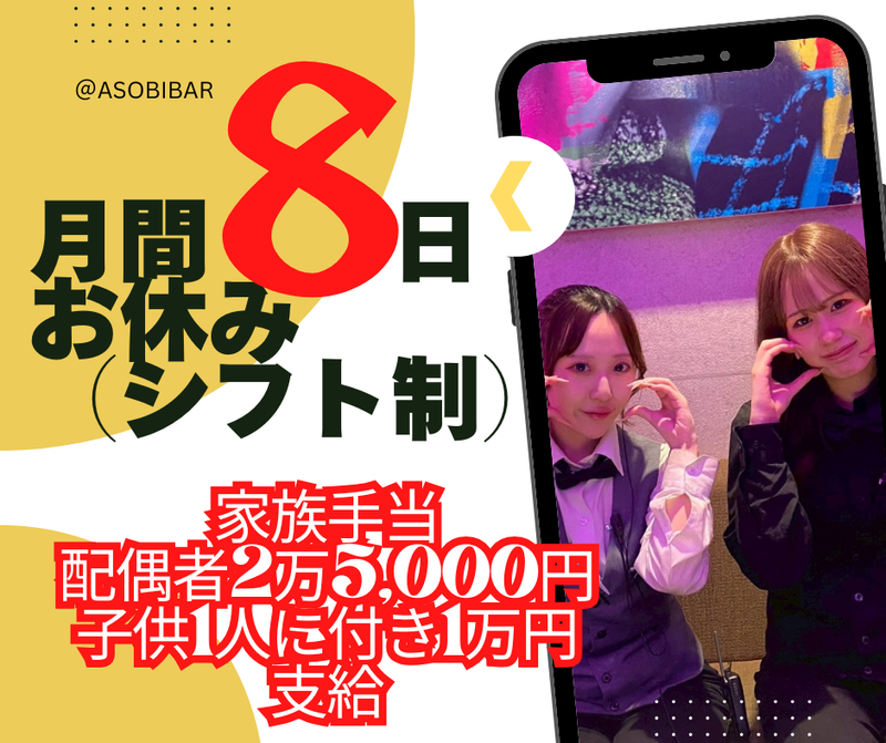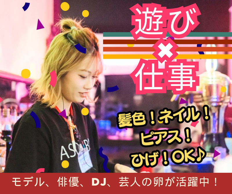求めている人材 【歓迎】 ・オープニング第二期生で働きたい方大歓迎! ・バイトリーダーとして、活躍頂けるフリーターの方は特に大歓迎! ・未経験者さん大歓迎!(初めてのバイトチャレンジも大応援!) ・これまでに接客や飲食店、サービス業界経験者さん、音楽フェスなどのイベントスタッフさん! …etc.エンタメ業界での勤務経験者の方も大歓迎! 【未経験からでも安心なシステムって?】 みんな初めは、未経験!そんなみなさんでも安心して、 お仕事ができるように社内研修をご用意しています。 仕事の「これってどうするの?」や「自己成長なども」なので、学生の方には就活で活かせるノウハウも! 一人ひとりのみなさんがチーム力やコミュニケーション力を身に着けて頂けるようにバックアップ! ・みんなが、楽しく成長できるプログラムでお迎えします! (分からないことや個人的なお悩みなどでも真剣に対応しますので、ご安心ください!) 【実は…】 お酒を飲まない!スタッフなんです。 (スタッフのみなさんは、飲酒はできません!ゴメンナサイ!でもソフトドリンクはOKで~す♪)