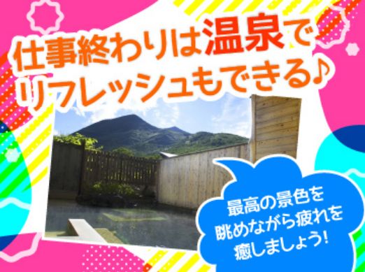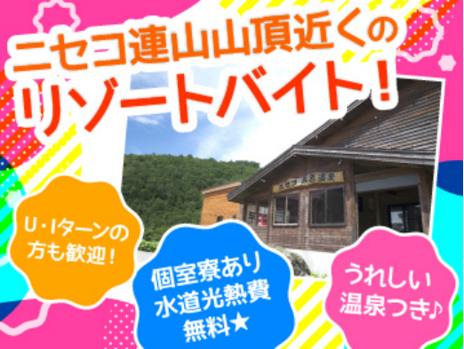 職場環境 雄大なニセコ山を目の前に、住み込みでのお仕事。 温泉利用や賄いも2食付いていて働きやすい環境! また従業員限定でニセコモイワスキー場のシーズンチケットが無料で利用できます! □リゾート 喫煙所:喫煙所あり(屋外) 受動喫煙対策として屋外に喫煙所設置
