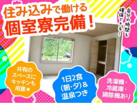 仕事内容 <温泉旅館のレストラン・接客・軽作業全般> 食事準備・配膳・飲料の注文受け・片付け等のレストランホール業務や、 客室・浴室・館内の清掃、客室へのご案内等、その他付随する旅館業務全般です。 ~絶景の大自然に囲まれて、住み込みでの業務!施設利用等環境抜群★~ 個室寮完備!仕事が終われば絶景の眺望の温泉にも入れます! サービスに関する旅館業務全般や実践的な英会話も学べる 「温泉レストラン・接客・軽作業」を募集! 熱意がある方や興味があるといった方大歓迎☆ ~1日の流れ~ 浴室清掃→朝食準備→後片付け→休憩→客室清掃→休憩→夕食準備→後片付け