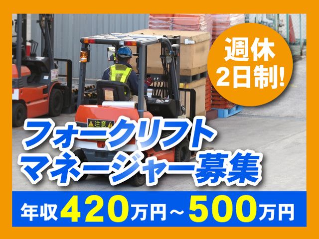 仕事内容 自社倉庫で、フォークリフトを使った貨物の入出庫や 現場管理を担当していただくお仕事です。 フォークリフト操作と現場全体の管理が両方学べる 多様な商品を扱うため、スキルの幅が広がる 従業員のシフト管理や教育にも携われるやりがい <具体的には…> 倉庫内での貨物の入出庫作業を中心に、フォークリフトを使った搬送作業を行います。 また、作業員の出退勤やシフトの管理、作業工程の進行確認やスタッフの教育もお任せします。 現場全体の円滑な運営を支える重要なポジションです。 扱う商品の温度帯は3つ(常温・冷蔵・冷凍)に分かれており、 多くの企業からご依頼をいただいています。 事務所内には専用デスクがあり、落ち着いて作業していただけます。 <現場をまとめるリーダーとしての役割> フォークリフト作業だけでなく、チームをまとめる管理者として、 スタッフのスケジュール調整や指導も担当。 安全で効率的な作業環境づくりに貢献できます。 <多様な商品を扱い、専門性が身につく> 生鮮食品から化学品まで扱うため、温度管理や取扱いのポイントを覚えられます。 物流業界でのスキルアップが目指せる職場です。 部門の体制強化のため新たに募集します。 フォークリフトの資格や倉庫での経験を活かし、現場管理のスキルも磨きたい方に最適な環境です。 ぜひ一緒に働きましょう。