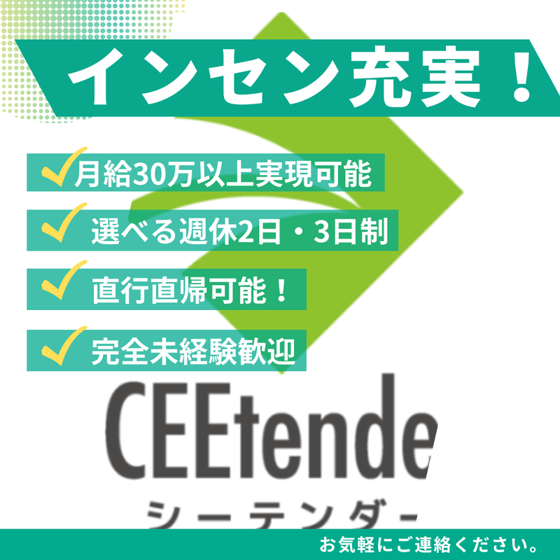仕事内容 【株式会社CEEtenderについて】 2019年設立、山口県周南市に本社を置く ベンチャー企業です。通信機器の販売支援 やイベント企画運営を通じ、地域活性化に 貢献。従業員約50名、売上1億円規模へ 急成長中。20代が50%を占める組織で、 社歴に関わらず個々の意欲を尊重する、 自由で活気ある社風が特徴です。 - この求人の特徴は... ★山口県内トップ級の日給1.1〜1.3万円 ★スタッフの約90%が毎日報奨金を受給 ★残業月平均0h!私生活を犠牲にしない ★直行直帰100%!仕事後は即遊びへ ★未経験でも安心の20時間座学研修あり ★独り立ちまで180日間、100%伴走 ★屋内活動60%で天候・日焼けの心配無 ★履歴書不要・私服面談で即日開始可能 - ■《イベントの盛り上げ役が最初の仕事》 「いきなりスマホの契約を勧める」 なんてことはありません。まずは、 お客様を笑顔にするのがあなたの役割! 【具体的な業務内訳】 ●集客アプローチ:約70% 風船やティッシュの配布、ビンゴ大会 などのイベント進行。 ●準備・片付け:約10% ブースの装飾や景品の補充など。 ●プランの簡易案内:約10% 興味を持たれた方への一次対応のみ。 ●専門スタッフへの引継ぎ:約10% 詳しい説明は先輩(クローザー)へ! ■《1人にはさせないチーム体制》 現場は必ず2〜4名体制。先輩が常に 隣にいるので、困った時はすぐに バトンタッチOK。独り立ちまでの 約180日間、あなたの成長を会社全体で バックアップします! - 【アピールポイント】 ■《「怖くない・難しくない」の証明》 「携帯販売ってノルマが厳しそう…」 「人間関係が大変そう…」 そんな求職者の不安を、数値と事実で 解消します。 ■《人間関係と社風のリアル》 平均年齢31.8歳。20代が半数を占める フレッシュな組織です。年1回の 社内フェスティバルでは、景品総額 30万円分を奪い合うほどの大盛り上がり。 ギスギスした雰囲気とは無縁です。 ■《「タイパ」を追求した働き方》 残業は月平均0時間。ショッピング モールの閉館時間が退勤時間なので、 1分も無駄な残業はありません。 直行直帰100%なので、事務所に 寄る必要もなし。仕事帰りにそのまま 下松や周南でショッピングや美容院へ 行くスタッフがほとんどです。 ■《数値化されたマニュアル完備》 「こんな時どうする?」は、すべて セリフまで決まったマニュアルあり。 「何を話せばいいかわからない」と 立ち尽くすことはありません。 -
