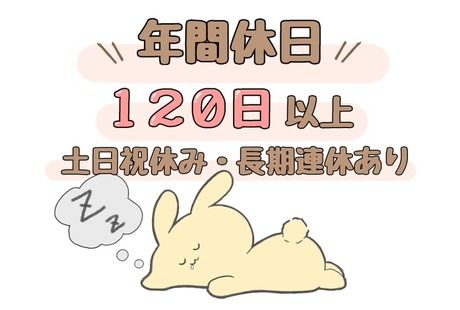 休日 完全週休2日制 (土日祝) 年間休日120日 (GW・夏季休暇・年末年始・大型連休あり) ※会社カレンダーに基づく