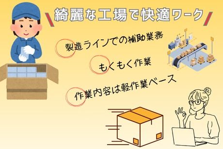 仕事内容 清潔な空間で、コツコツ続けやすいお仕事です♪ ☆皆勤手当て、ありまぁす☆ 工場のお仕事が初めての方も活躍中♪ 作業はシンプルで、特別な知識や経験は必要ナシ☆ まずは見学だけでもOKなので、雰囲気を見てから決められます♪ ――――――――――――――― ◆ お仕事内容 ◆ ――――――――――――――― 人気コスメを箱に入れる、シンプルな梱包作業! 作業の流れは決まっているので、覚えやすく安心♪ ・製品のチェック ・箱に入れて梱包 ・出荷の準備 扱うのは手のひらサイズの商品が中心◎ 落ち着いたペースで進められる工程です♪ ――――――――――――――― ◆ 教育・フォロー体制 ◆ ――――――――――――――― マニュアル完備&先輩が近くでサポートします♪ 一つずつ作業を覚えていけるので、自然と慣れていけます。 「分からない」をそのままにしない環境です◎ ――――――――――――――― ◆ 勤務環境・働きやすさ ◆ ――――――――――――――― ・日勤のみ ・土日祝休み ・空調完備の清潔な作業スペース ・落ち着いた雰囲気でモクモク作業 ・社員食堂あり(定食180円~) ――――――――――――――― ◆ 一日の流れ ◆ ――――――――――――――― 8:30~ 業務開始! 10:00~ 15分の小休憩(ちょっと一息◎) 12:00~ お昼休憩(おしゃれな食堂で格安ランチ☆) 12:45~ 業務再開(午後からもがんばっていこう!) 15:00~ 15分の小休憩(ここでいったんリフレッシュ◎) 17:05 業務終了!おつかれさまでした☆ そのあとは夕食のお買い物や、 お子様のお迎えに行くスタッフもいらっしゃいます! 終業時刻も早めなのでジブン時間もしっかり取れますよ! ――――――――――――――― ◆ 待遇・働きやすさ ◆ ――――――――――――――― ・月給制で収入安定 ・皆勤手当あり(規定あり) ・交通費支給 ・社会保険完備 ・制服貸与 ・長期休暇あり 「毎月の収入が安定している」のは、 家計を考える上でも安心ポイントです♪ ――――――――――――――― ◆ 向いている人 ◆ ――――――――――――――― ・コツコツ進める作業が好き ・清潔な環境で働きたい ・決まったリズムで働きたい ・長く続けられる仕事を探している ひとつでも当てはまれば、 あなたにフィットしやすいお仕事☆ ――――――――――――――― ◆ 応募について ◆ ――――――――――――――― ・履歴書不要 ・スマホから1分で応募OK ・職場見学だけでもOK 「まずは雰囲気を見てみたい」 そんなスタートで大丈夫です♪ 迷っている時間が一番もったいない! まずは話を聞いてみるだけでOK! 「違うな」と感じたら、その場で断っていただいて大丈夫! 応募は【応募ボタン】から1分ほどで完了。 面倒な入力はありません。 あなたのご応募を、お待ちしています。 業務の変更範囲:「会社の定める業務」