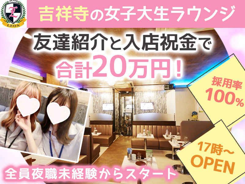 高時給で稼げる♪吉祥寺の学生専門ラウンジ『LEON』 .*★ 狙い目!大量募集 ★*. ………………………………… キャストさんの卒業にともない 新人さんを大量募集中です♪ 人柄採用しているので 未経験で自信が無い方も安心して ご応募くださいね! .*★ 体験入店∞無制限 ★*. ………………………………… 面接後、採用された方は 状況により即日の体験入店が可能です! 6時間保障つきなので、体験日の当日から ガッツリ稼げますよ♪ 回数は無制限なので、 納得するまで何回でも大丈夫です! 本入店を強制することもありません☆彡 .*★ 働きやすさ◎ ★*. …………………………… ☆ノルマなし ☆罰金・ペナルティなし ☆強制出勤/シフトカットなし ☆ビラ配りなし ☆店舗前での声掛けなし ☆お酒が飲めなくてもノンアルでOK 店内には常時5名以上の スタッフと店長などの社員さんがいるので 困ったときはスグに声をかけてくださいね♪ .*★ 各種バックあり ★*. ……………………………… バック=お客様にいただいた ドリンク等に対してキャストに支払われる インセンティブのこと♪ 時給に+αでお小遣い稼ぎになりますよ☆