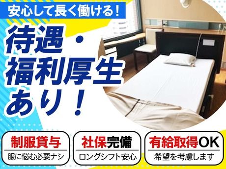 【保険制度】 雇用保険、労災保険、健康保険、厚生年金 待遇・福利厚生 【福利厚生】 【安心の福利厚生】 ――――――――――――――― ■社会保険完備 ■長期休業収入補償保険 (※社会保険加入者のみ/満60歳まで) ■労災補償上乗せ保険 (※労災保険加入者のみ) ■インフルエンザ予防接種 ■制服貸与 【お給料にプラスの手当】 ――――――――――――――― ■昇給あり ■残業手当 ■交通費規定支給 【お休み・休暇制度】 ――――――――――――――― ■有給休暇 (入社6ヶ月経過後、最大10日付与) ■特別有給休暇 ■時間単位有給休暇 ■積立有給休暇 ■産休・育児休暇 ■通院休暇 (妊産婦健診受診時)