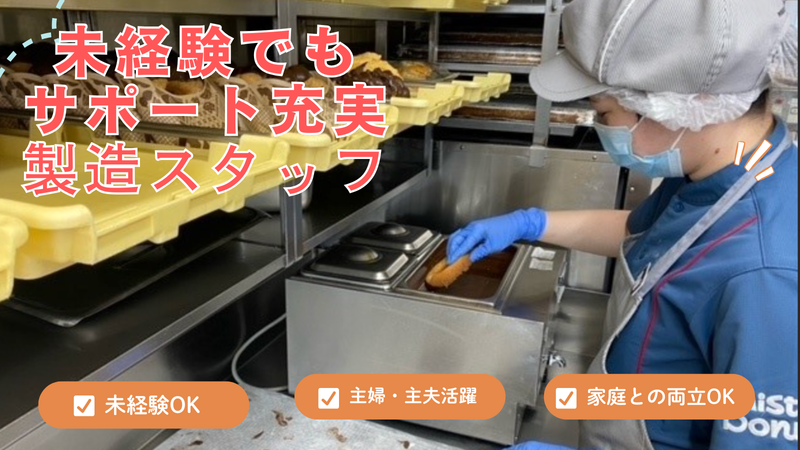 仕事内容 ◎朝5-7時は高時給1325円~ ◎ドーナツの生地づくりが できるようになると時給150円UP! ◎週3日~OK! ■簡単な作業からお任せ♪ ドーナツづくりの仕上げや簡単な製造/調理をお任せ。 まずは簡単なトッピングやチョコをつける仕上げ作業から~♪ 1ヶ月程度で一通りの仕事は覚えられます。 コラボ商品や新商品があると忙しくなりますが、 写真付きの分かりやすいレシピがあるので安心! 接客なしのモクモク作業がほとんどです。 ■主婦(主夫)さんも活躍中!! お子さんが大きくなって久しぶりのパート… という方も大歓迎! 育児と両立しながら働くママさんも 多数活躍中の職場です。